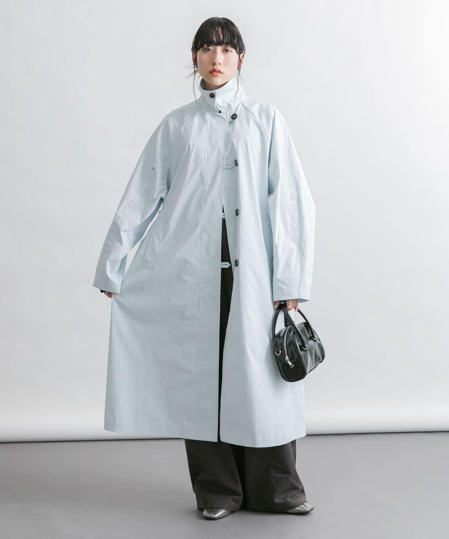 水色のステンカラーコートとバッグを主役にするために他をダークトーンでまとめました