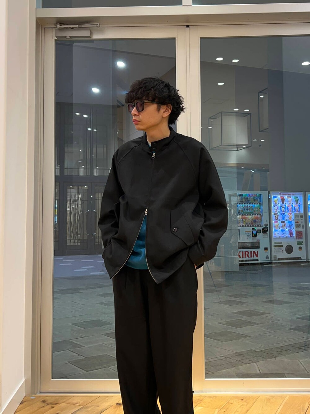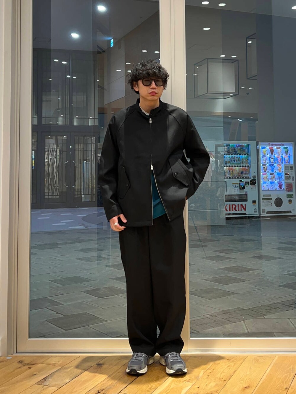 セットアップを着用したスタイリングです。