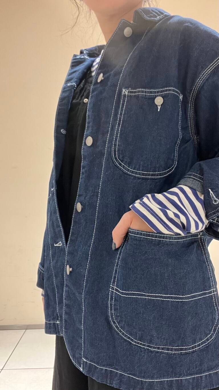 素材のシャリ感と、程よいゆとりでスウェットやパーカーの上からラフに羽織れて、これからの時期に大活躍してくれるアウターです◎