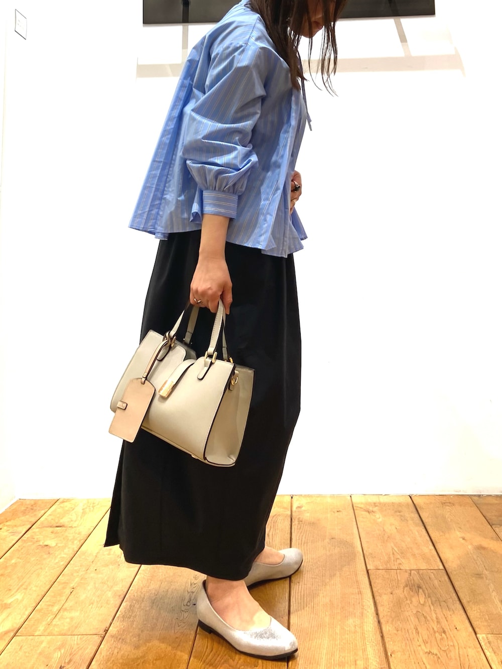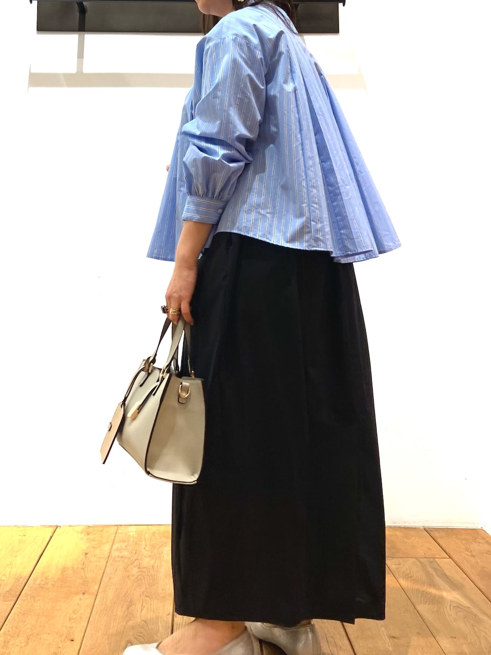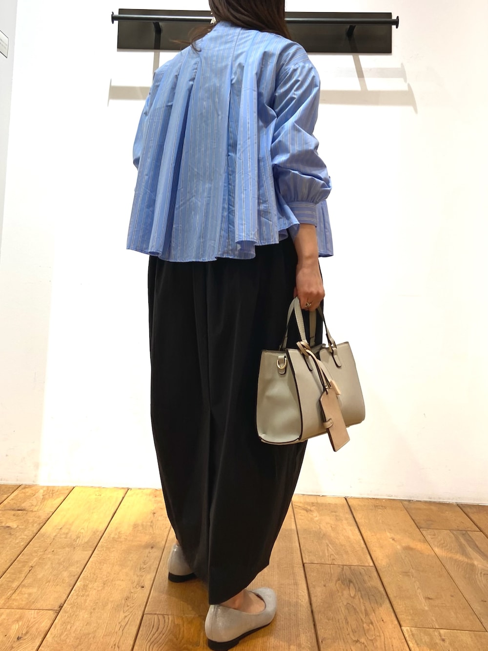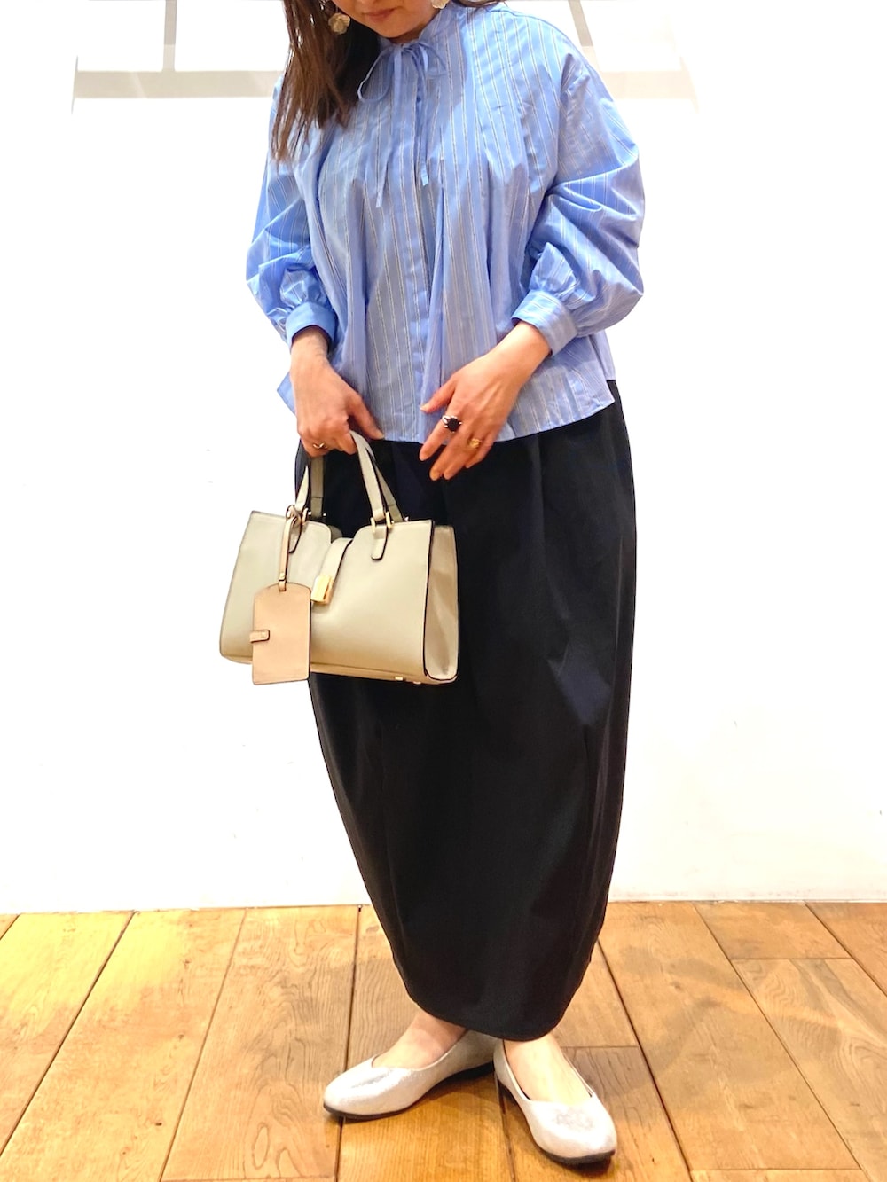 首元にリボンのついたデザインのガーリーな綺麗めシャツに、バルーンスカートを合わせて、究極のガーリースタイル