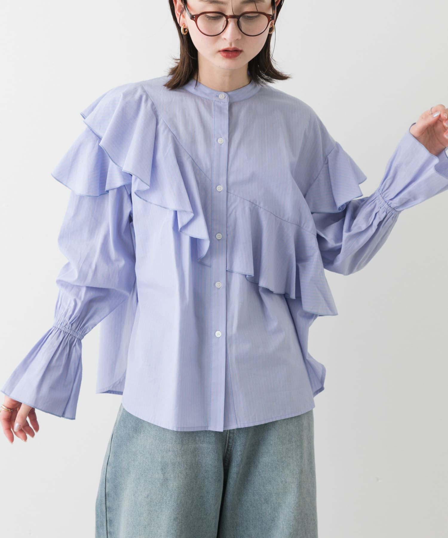 肩幅が広くて着られない!とおっしゃるお客様もいらっしゃるのですが、フリルの位置が絶妙なので案外気にならない魔法のブラウス。めちゃくちゃ華奢見えします!! --------------------------------------------------