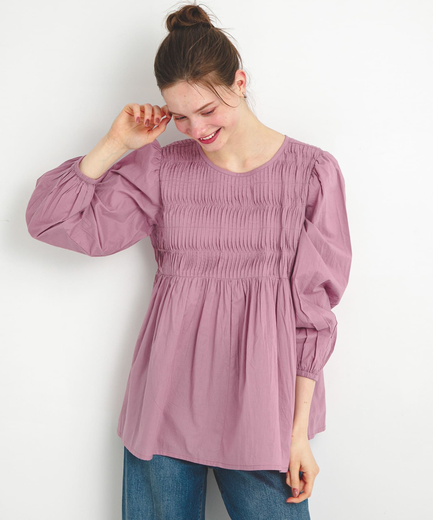 顔まわりの細やかなピンタックデザインに、胸下からふわりと広がるシルエットは、女性らしさを演出。