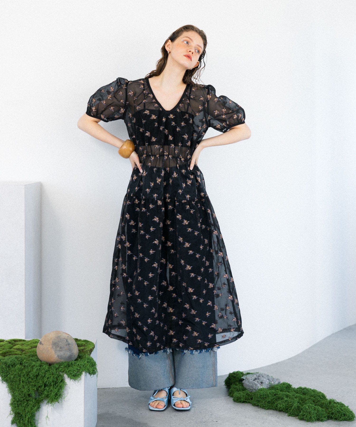 透け感のある春夏らしいワンピースに表面に凹凸感のある刺繍が散りばめられた華やかなアイテムです✨️前後2WAYで着用できるのでスッキリ見せたいときはVネック、優しい印象にしたいときはクルーネックで🙆🏻‍♀️