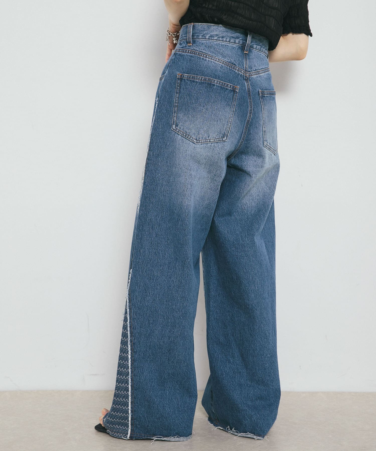 サイドのジャガードデザインが目を引く着映え間違いなしのデニムです!脚のラインを拾わないわたり幅と脚長効果抜群のシルエットでスタイルアップも叶います🪄