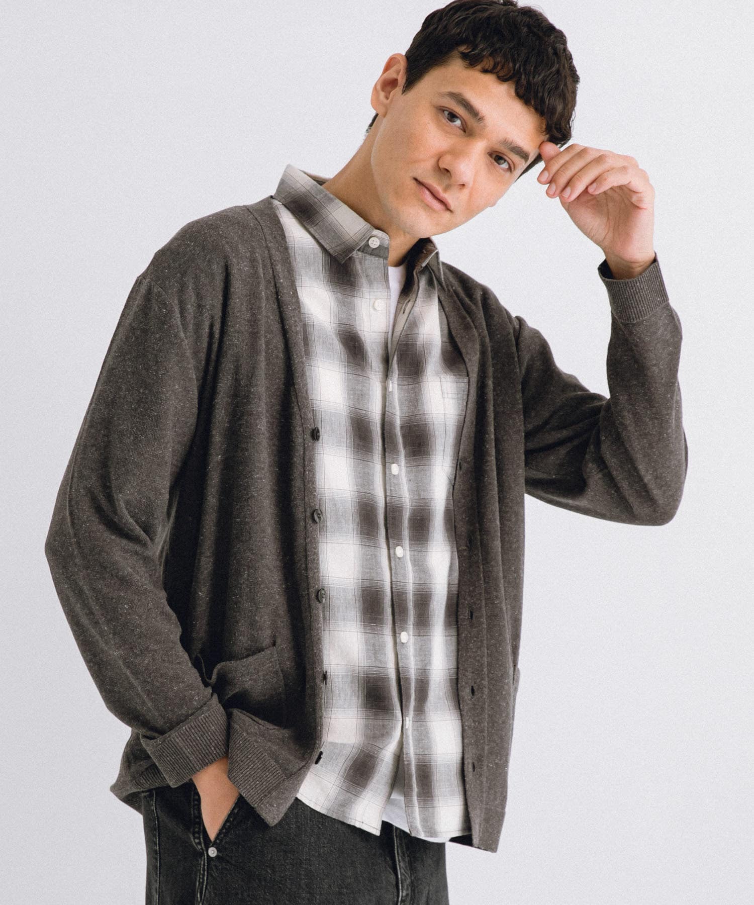 リネンの通気性と化繊のしなやかさが融合した夏対応のカーディガン。