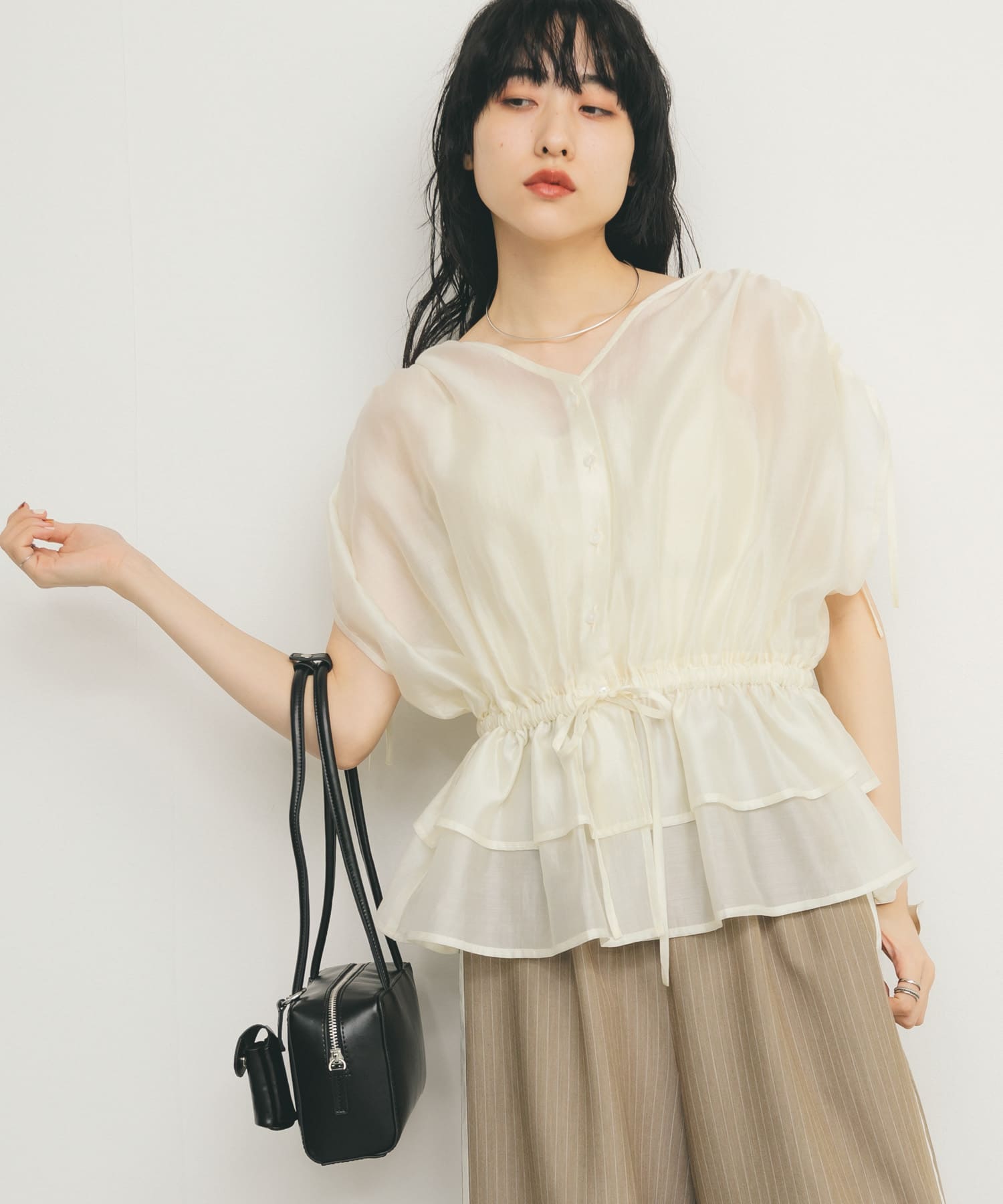 シアー感やたっぷりギャザー、袖のドロストデザインなどかわいいポイントがたくさんあります😆ふわふわしたシルエットですが、ウエスト部分はキュッとしているのでスタイルアップもできます^_^♡