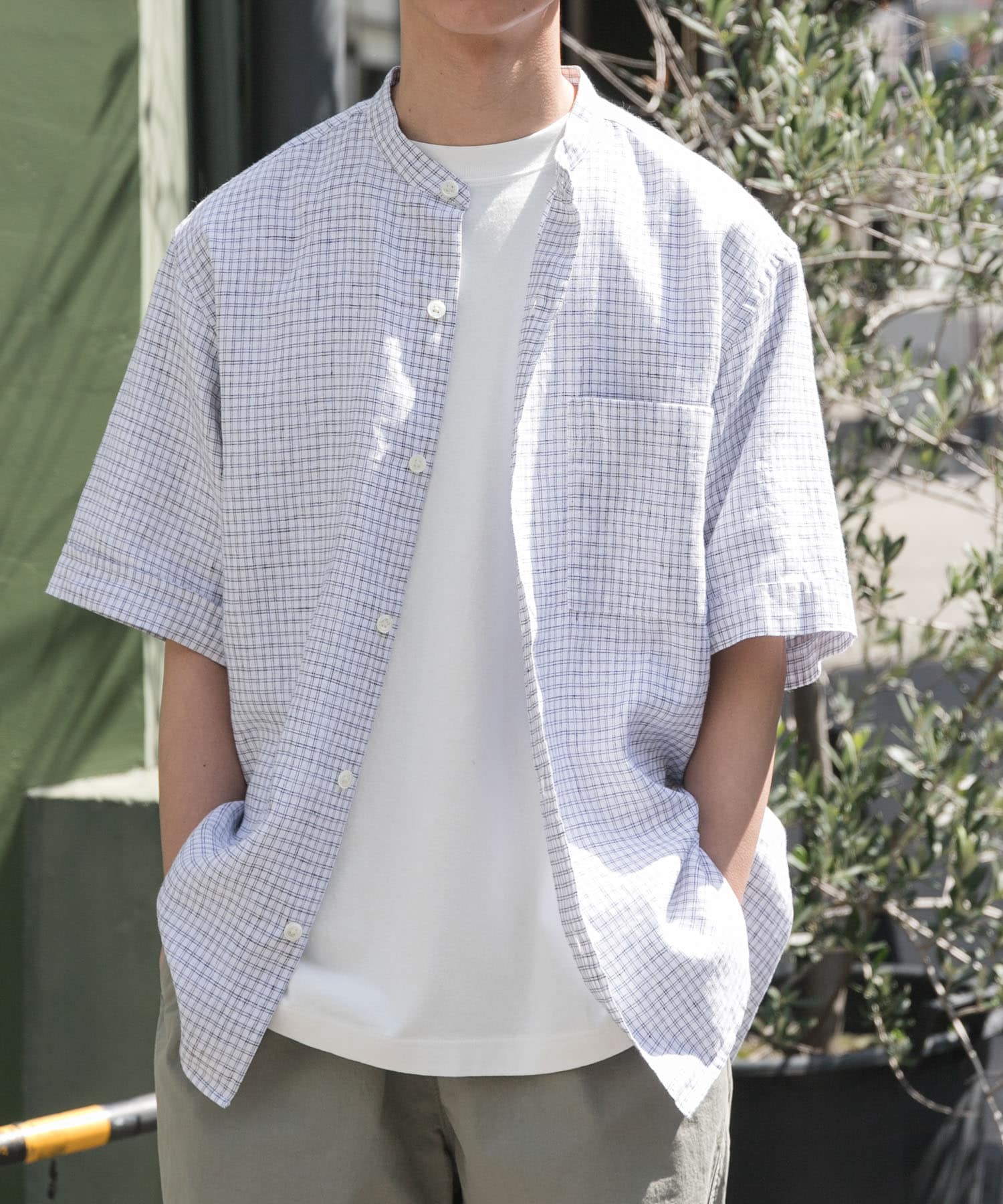 シャツは、コットン×リネンを使ったバンドカラーシャツです!