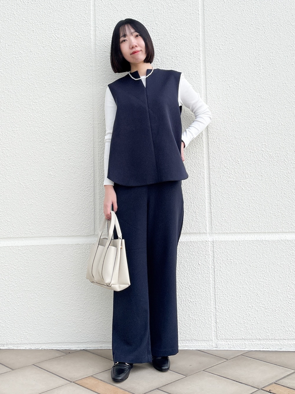 スカートは外側にポケットがついたカーゴデザイン。綺麗見えする素材でシワにもなりにくいので合わせてみました。ポケットがあるので通常のタイトスカートよりもラインが気にならないですよ♩