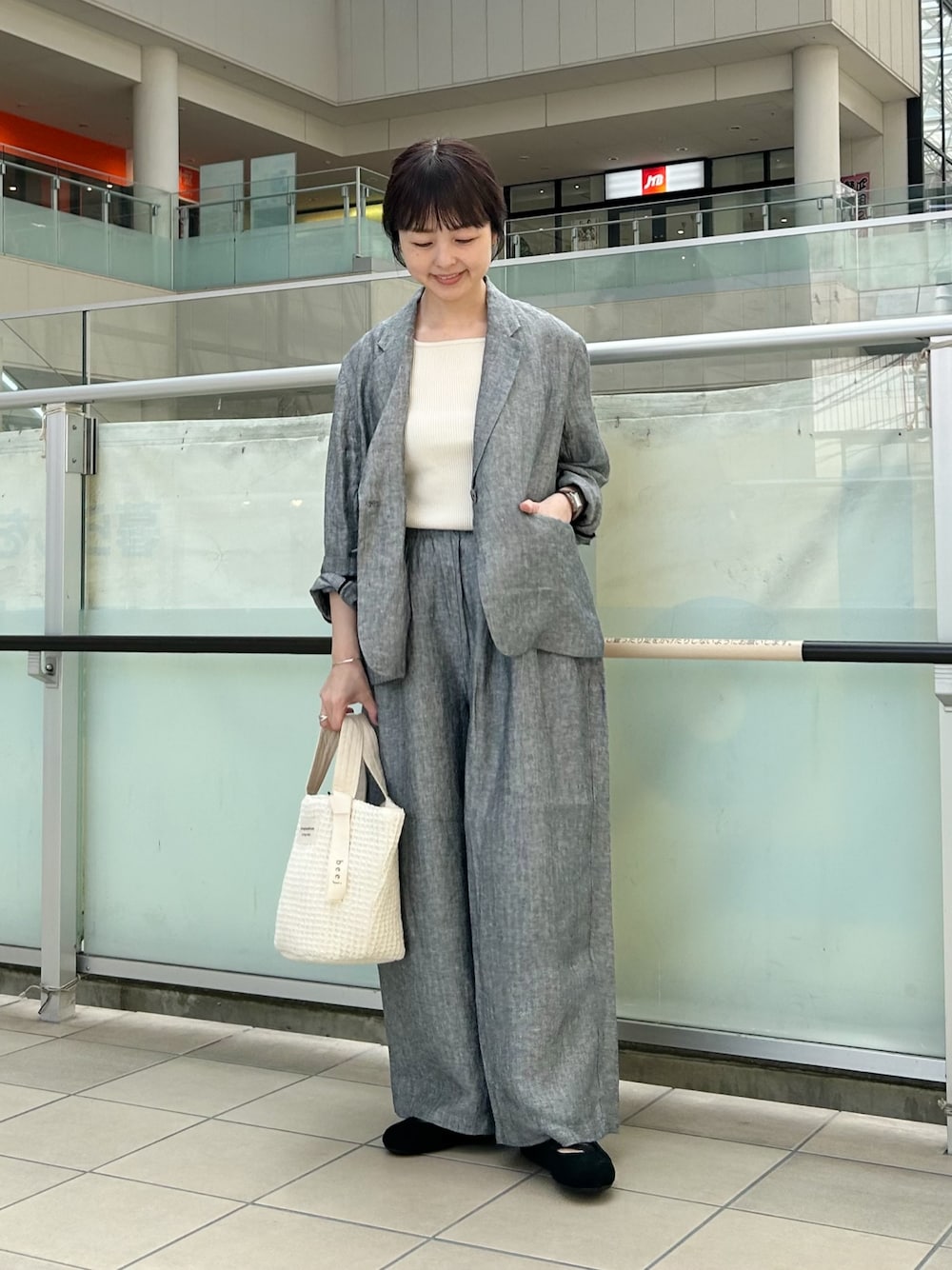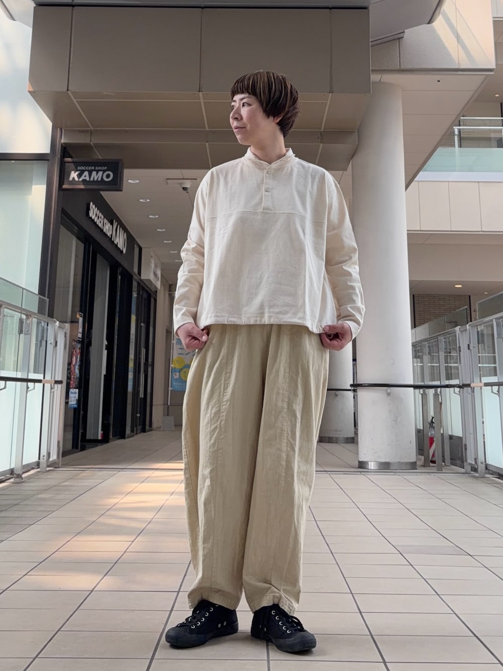 ボトムは明るいカラーのイージーパンツを合わせました。