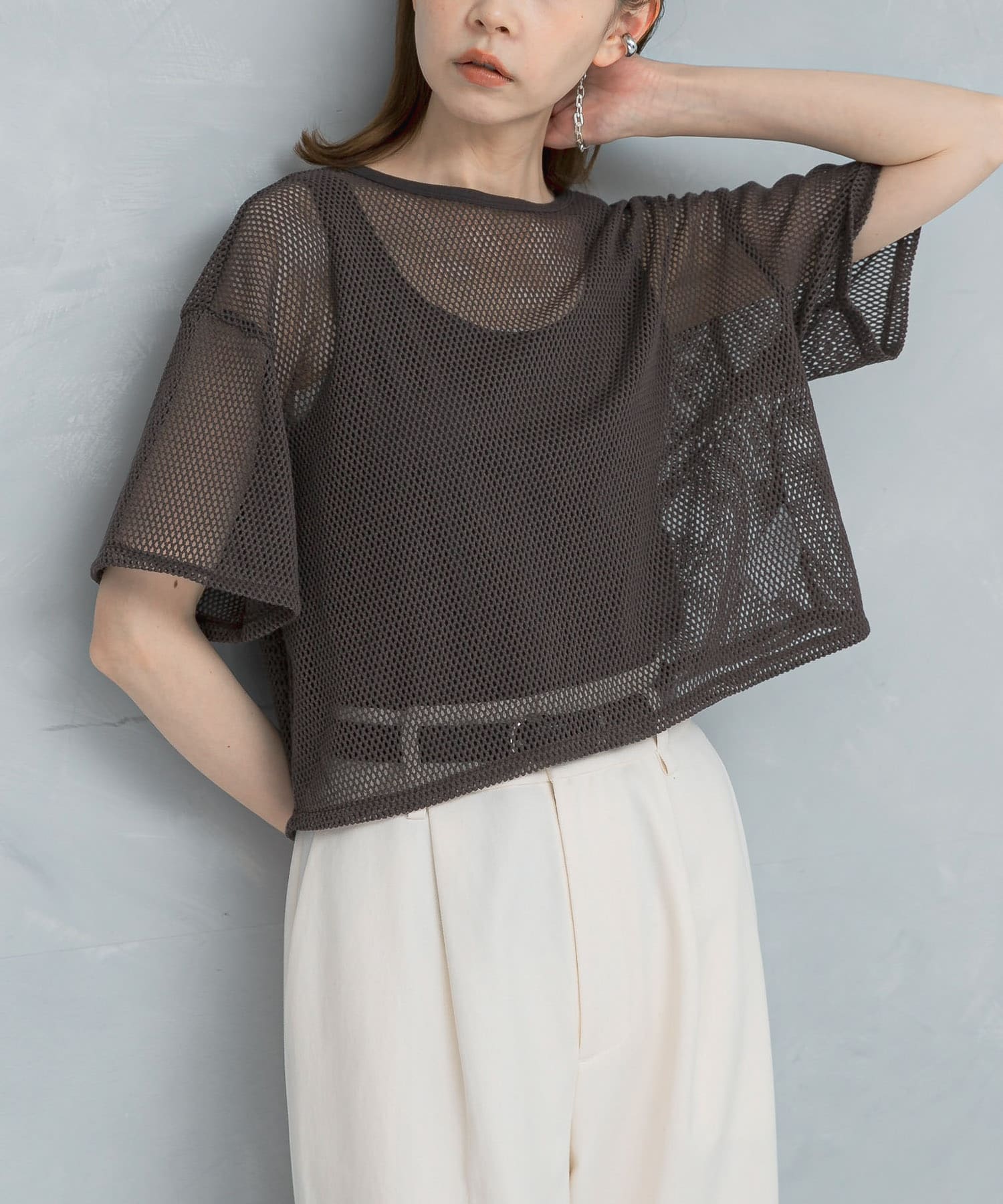 インナーはタンクトップで下着感がなくメッシュアイテムも挑戦しやすくて◎