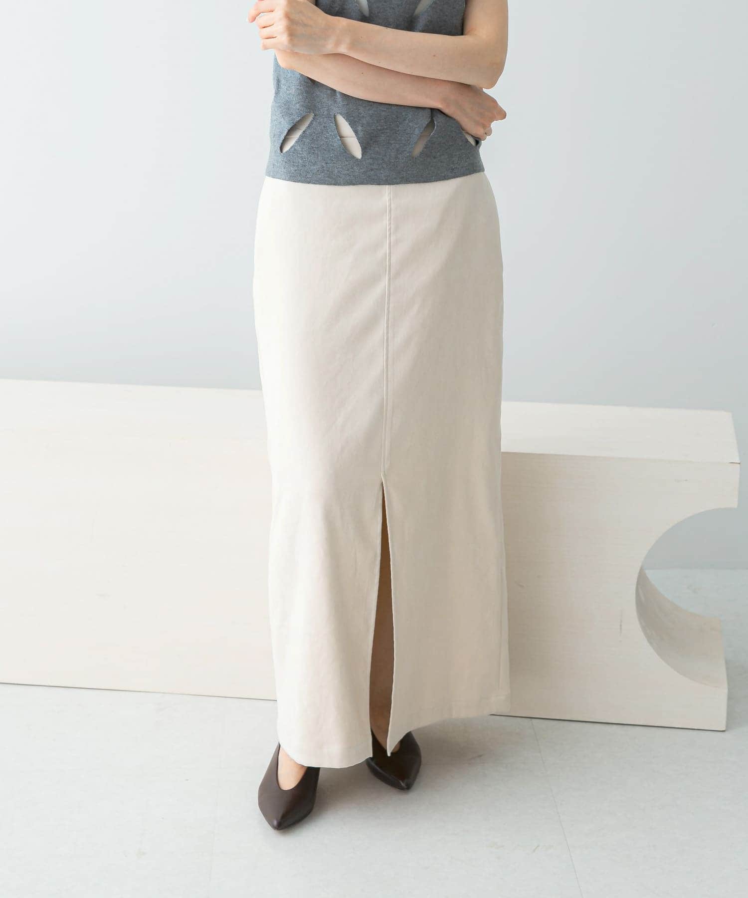 柔らかい肌触りが魅力的なストレートスカートは、フロントのスリットで抜け感をプラスできますよ!