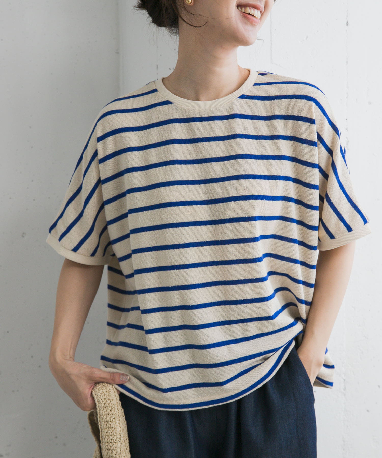 トップスはゆとりがありブークレ素材でベタつきにくいです◎