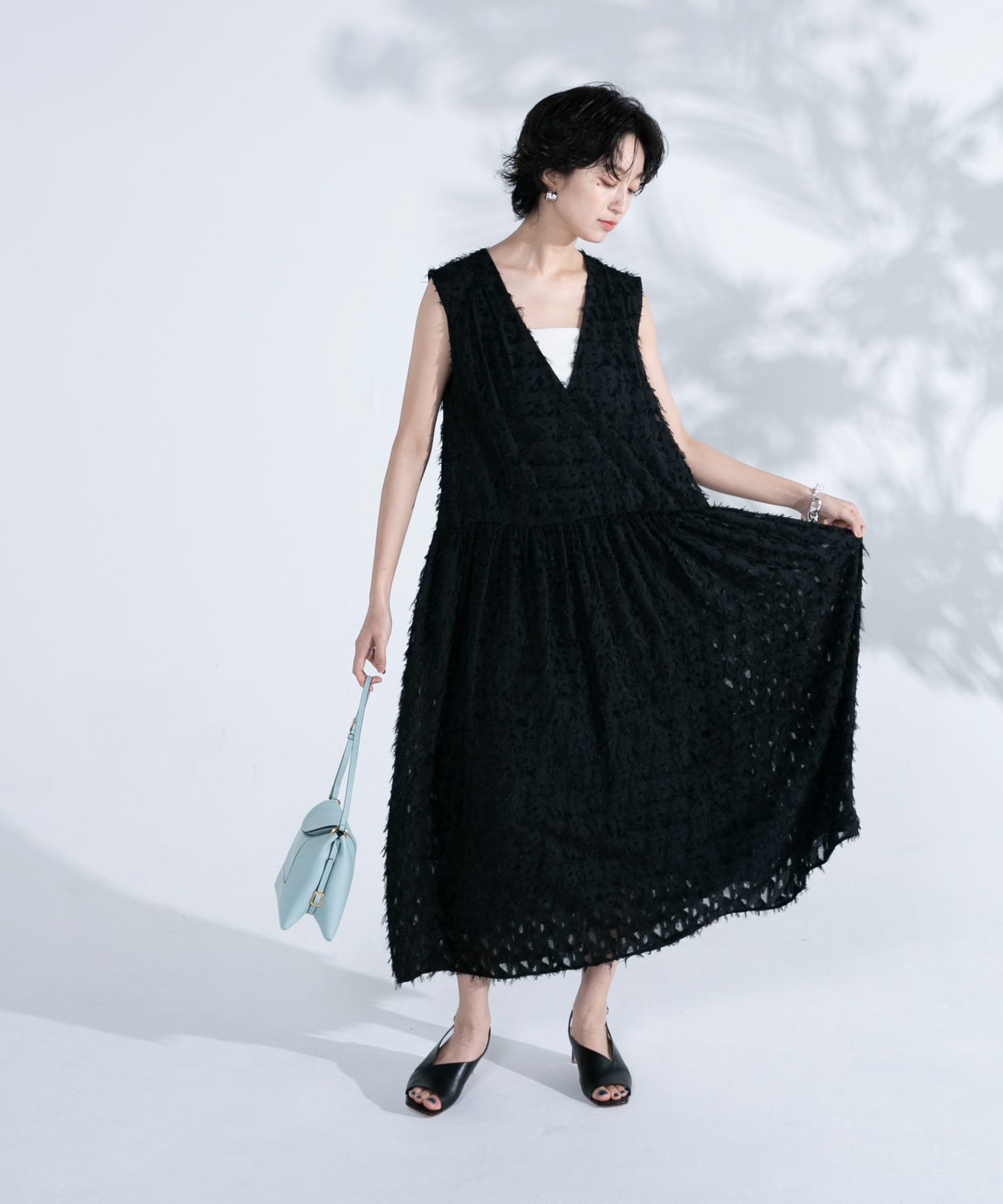 ジャガードで1枚で華やかに着れるワンピースです。ブラックだと普段はもちろんお呼ばれシーンにも活躍します。