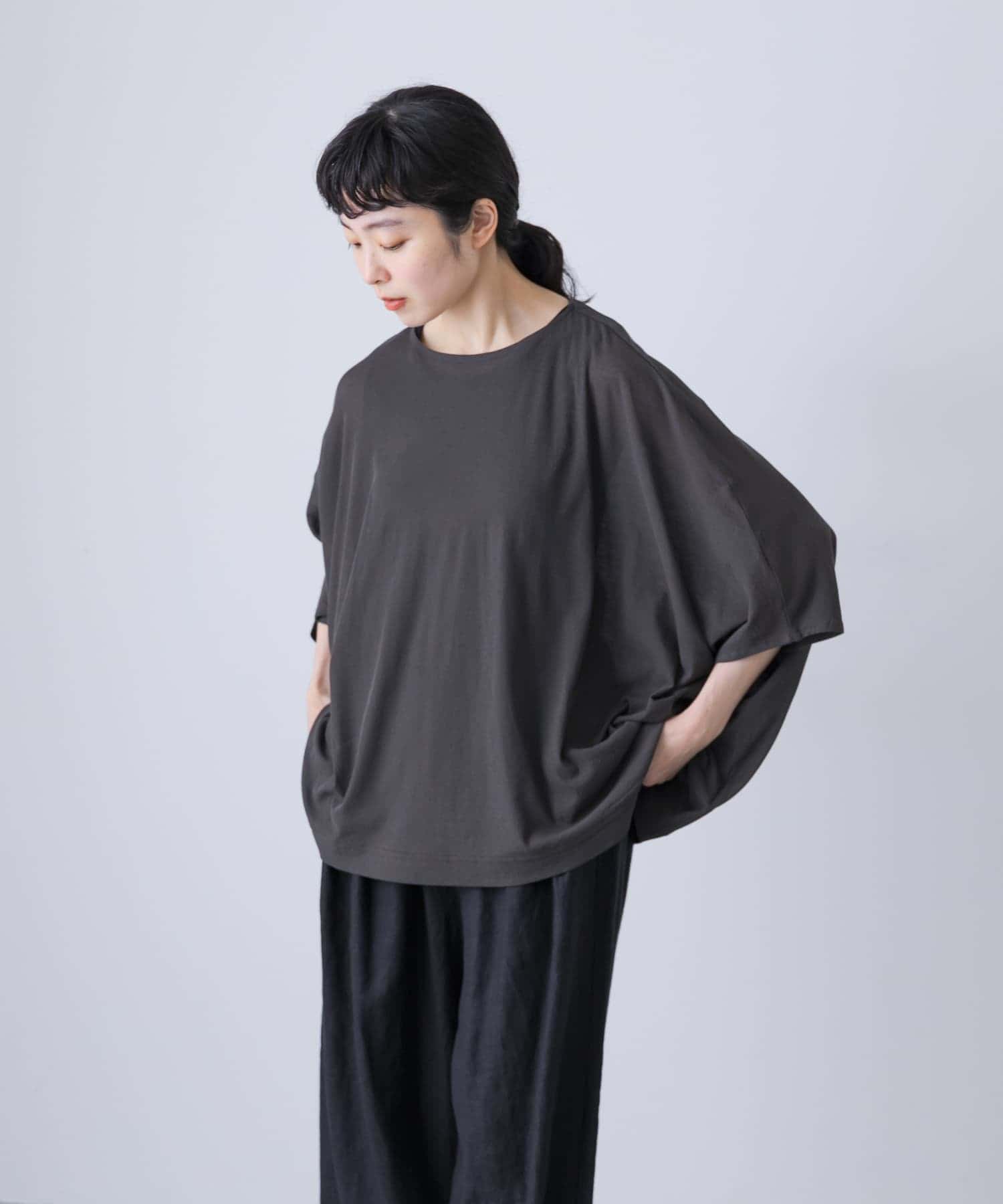 チャコールの落ち着いた色味が大人っぽい、コットンシアーワイドカットソー。程よい透け感が軽やかさを与え、ゆったりとしたシルエットでも重く見えません。前だけをボトムスにインすることで、抜け感とこなれ感を両立。