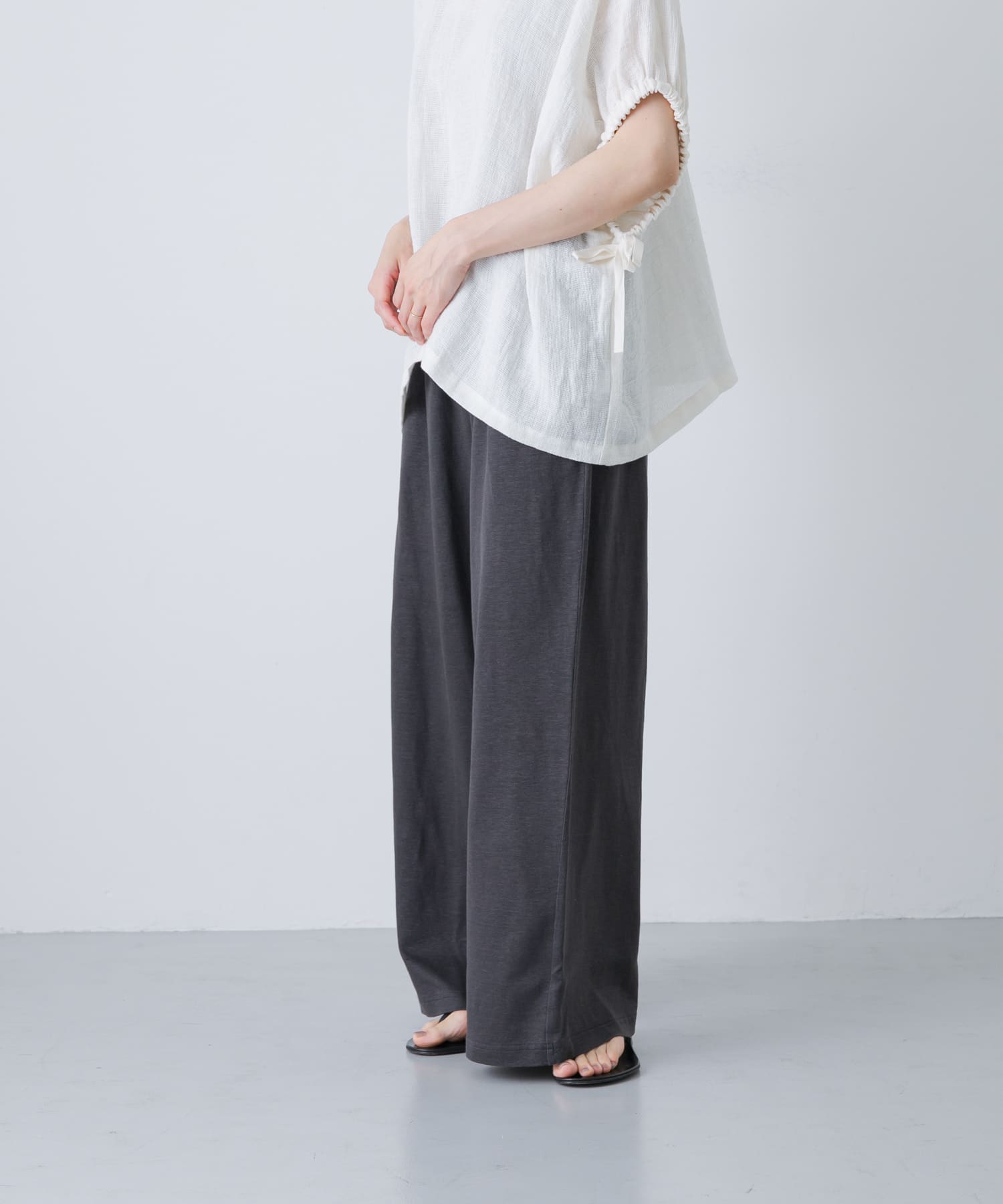 ボトムスにはCHARCOALカラーのイージーパンツを。落ち着いたトーンながら個性のあるデザインが、ナチュラルコーデに奥行きを与えます。