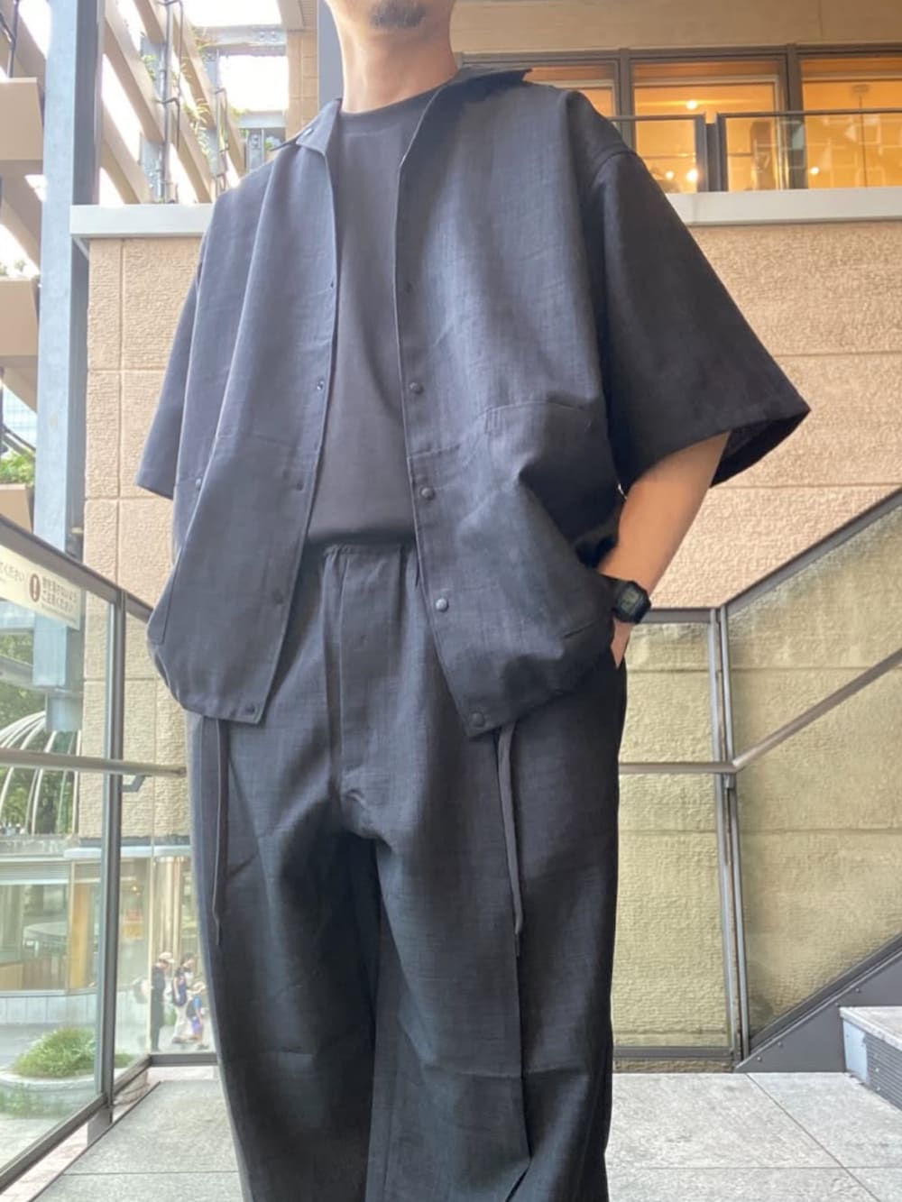 同素材のパンツも展開しているので、セットアップでの着用も可能です。