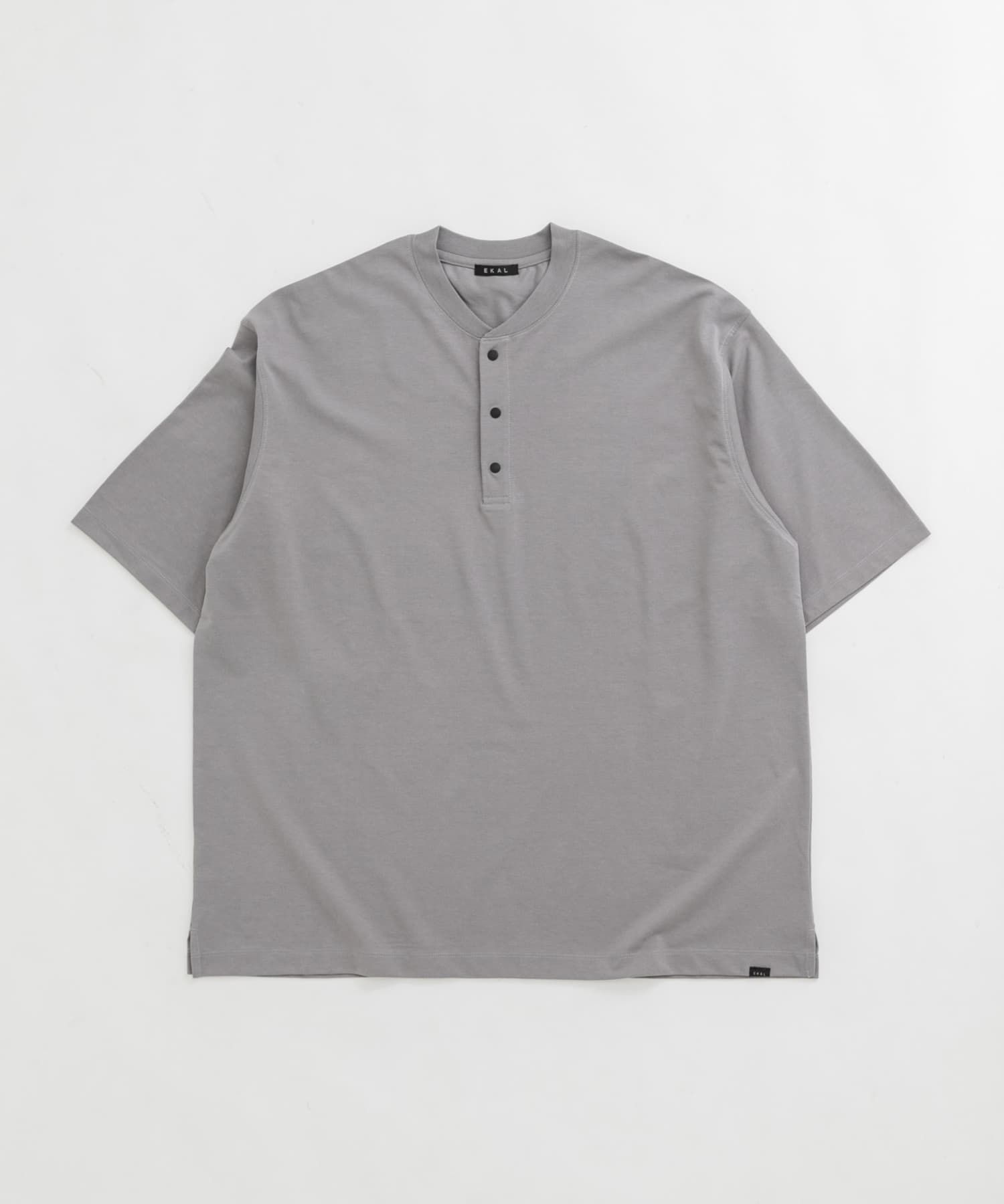 天竺編の三つ釦ヘンリーネックTシャツ。