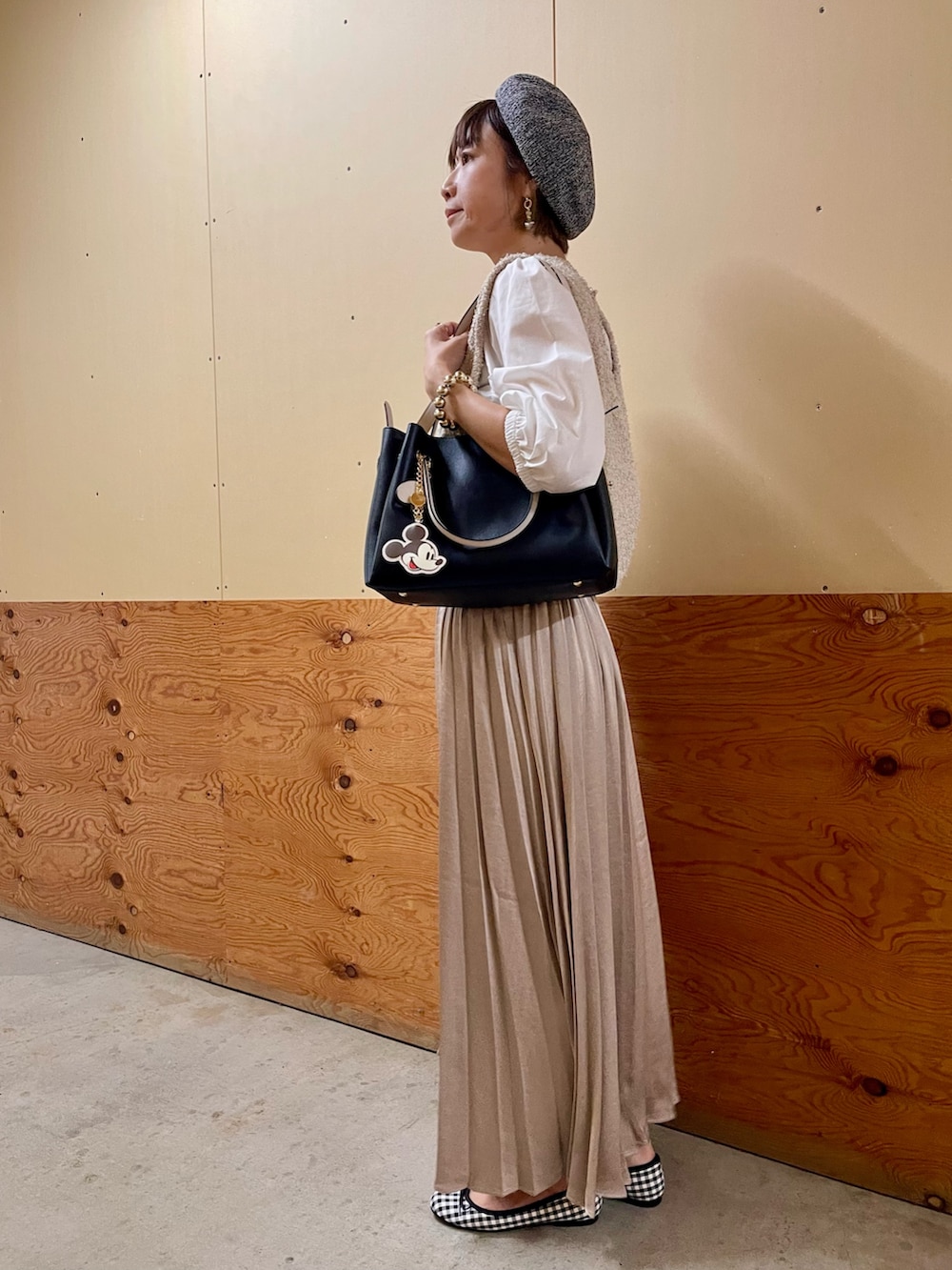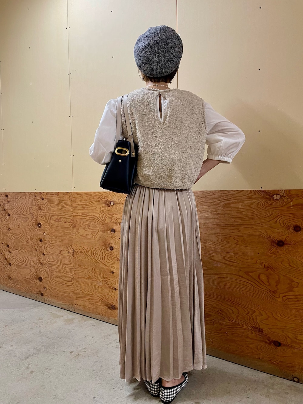 同系色コーデに、黒小物で引き締めました。
