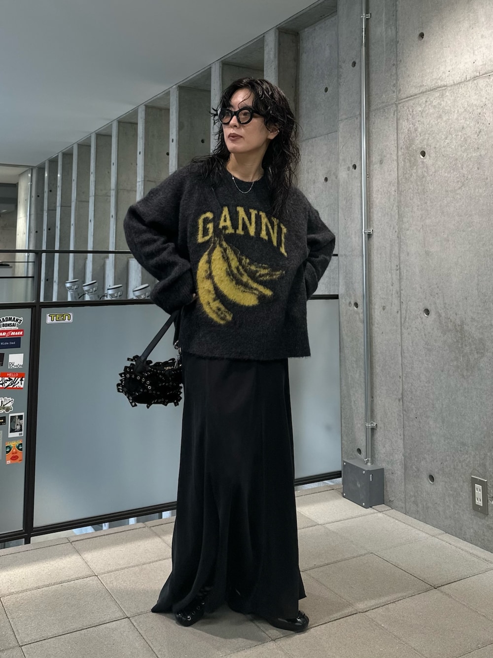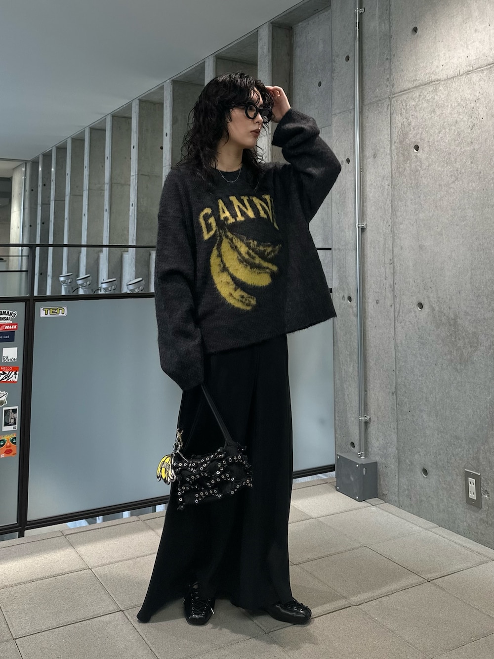 ganniらしいキャッチーな柄がポイントのモノトーンニット。これがスウェットだったら、ヤングカジュアル過ぎるわけですが、毛足の長いニットならではの品良さがあります。