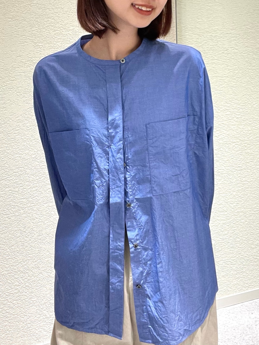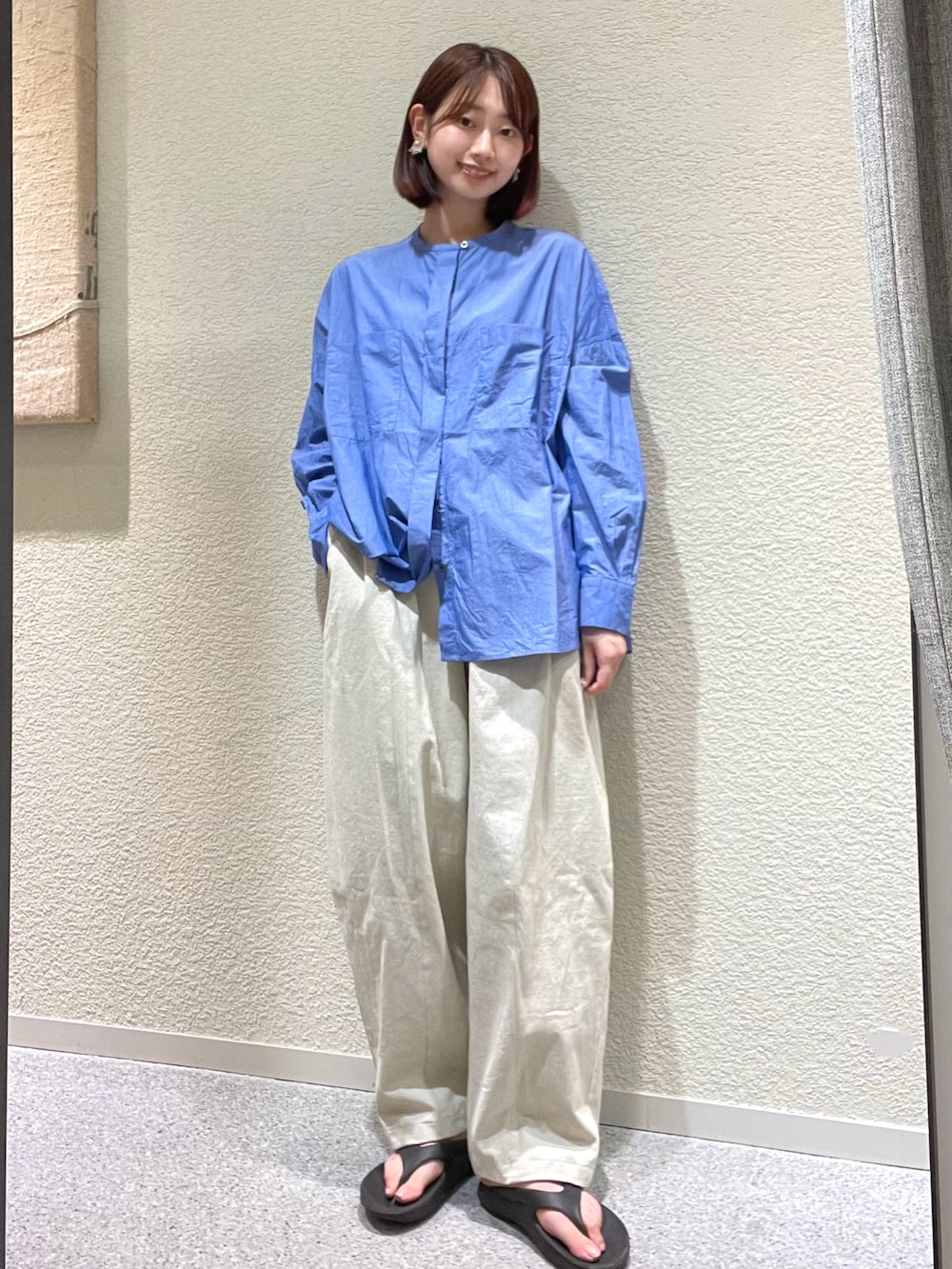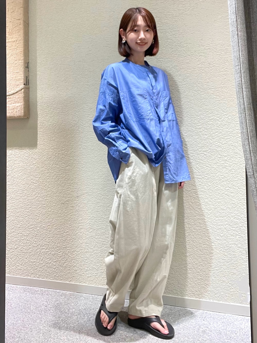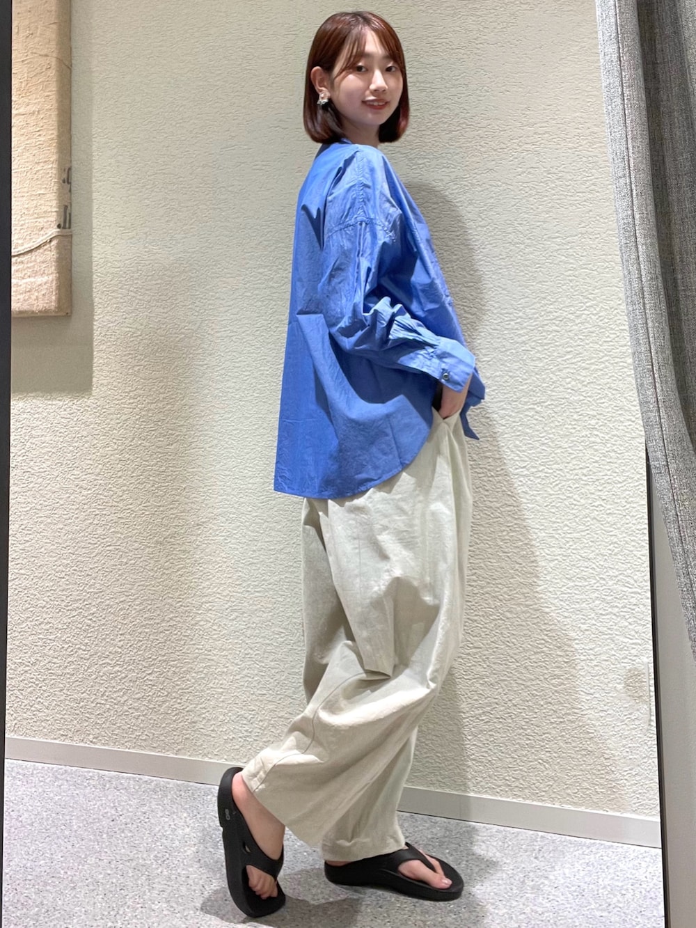 トップスは鮮やかブルーが可愛いコットンダブルポケットワイドシャツを着ました!ハリ感のある素材で、ゆとりのあるシルエットが特徴です。前を全部留めてスッキリ見せつつ、オーバーサイズ感で抜け感を出しました✨