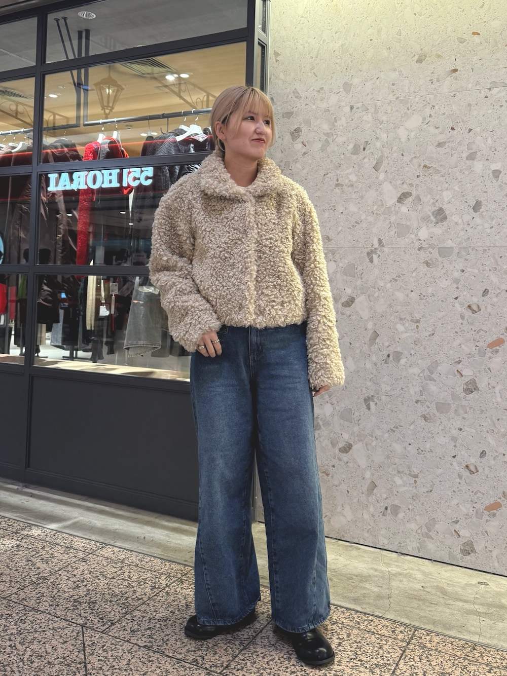 ミニスカートのままショートブーツ合わせも間違いないですが、足を出したくない方にはこちらのフレアパンツが、ほどよくフィットしてくれてレイヤードにおすすめです✨