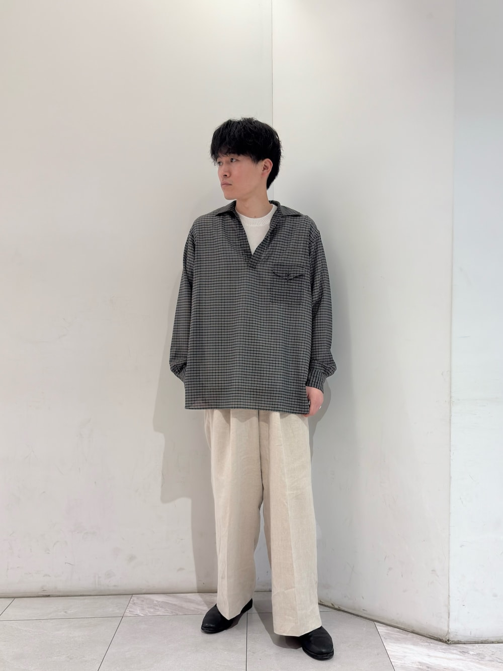 着丈の長さやフロントのスナップボタンはウエスタンシャツらしさを残しつつ、フラップポケットがないことでミニマルな印象に。