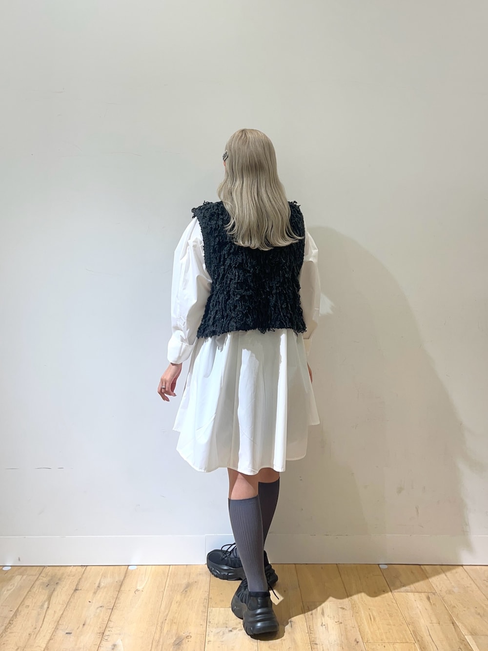 ワンピースは真っ白でフレアなデザインなので、ベストは濃いめの色で上に重心がいくようバランスをとりました。