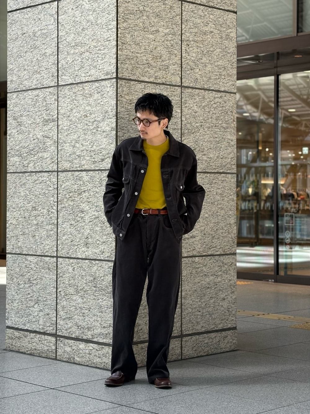 トップスは今からでも着れる和紙ニットロンT。デニムは様々なメゾンブランド使われている岡山県産カイハラデニムの今季の新型。加えて、ネイビースエードの上品とラフさがミックスされたモルフェバッグ。非常にいなたいですね。ただ、そのいなたさが格好良いんじゃないかと思います。