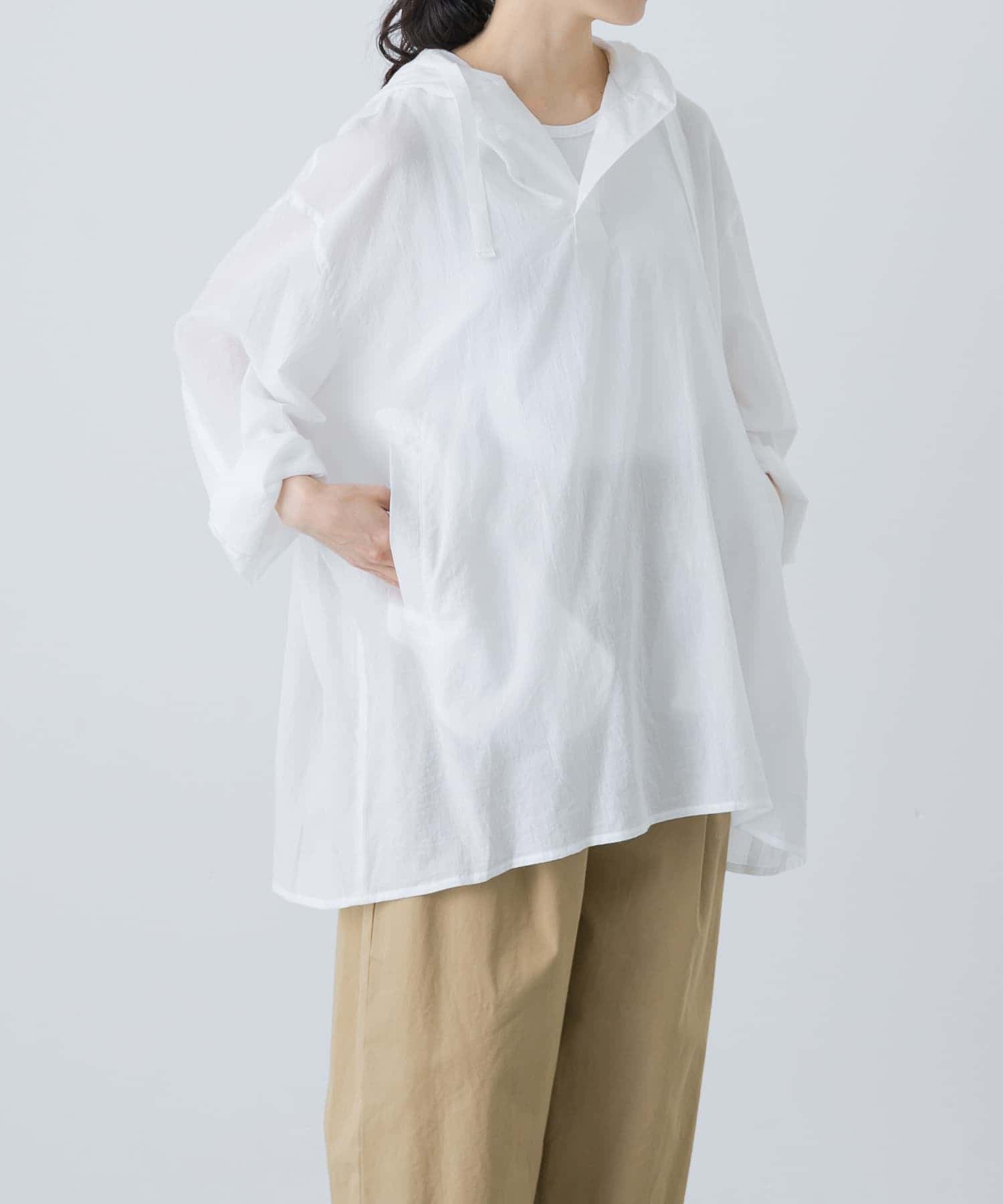 透け感のある薄手なフーディブラウスは私も愛用しています!とっても柔らかな肌触りで夏場も着やすく、インナー次第で長くお使いいただけます。今回はボーダーカットソーを合わせて柄を透けさせています。色々な合わせをお楽しみください♩