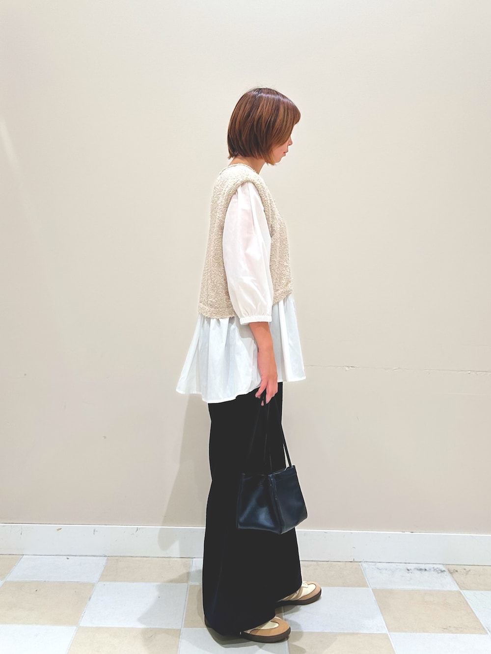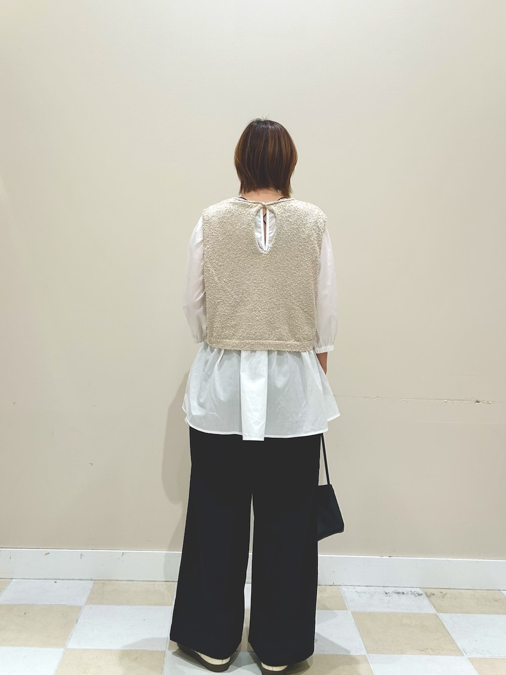 ニットベストとチュニックブラウスのドッキングで一枚でデザイン性のあるトップス。