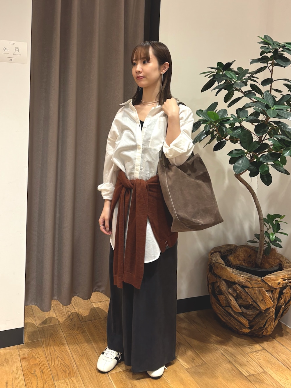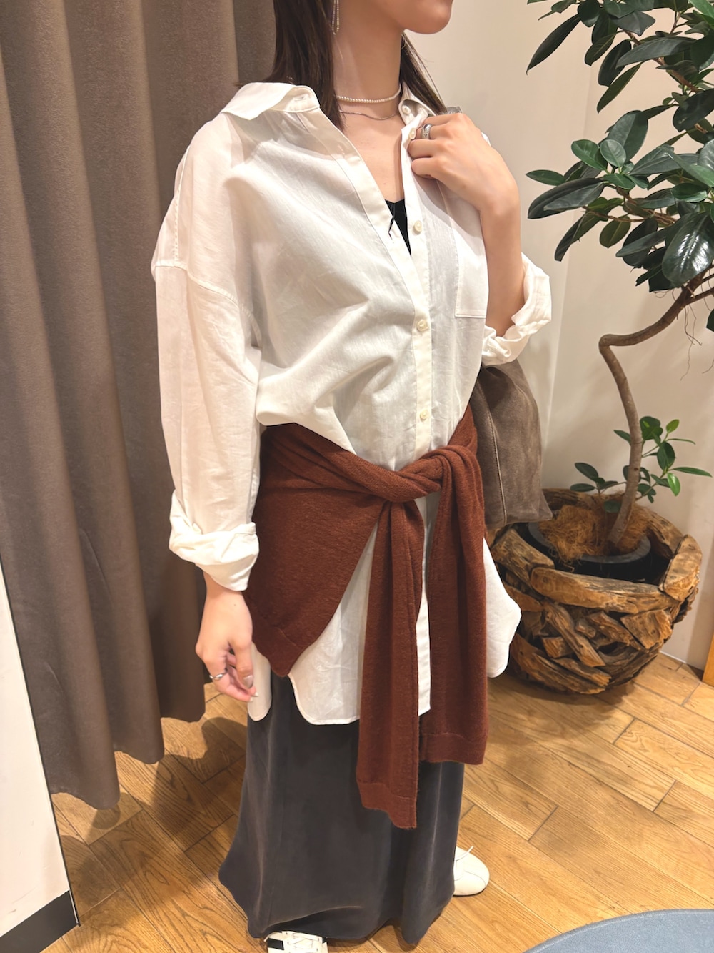 私の身長でのロングシャツコーデは着せられてる感がでてしまい躊躇しやすいですが、腰巻きニットを取り入れるだけで軽めの印象になります!