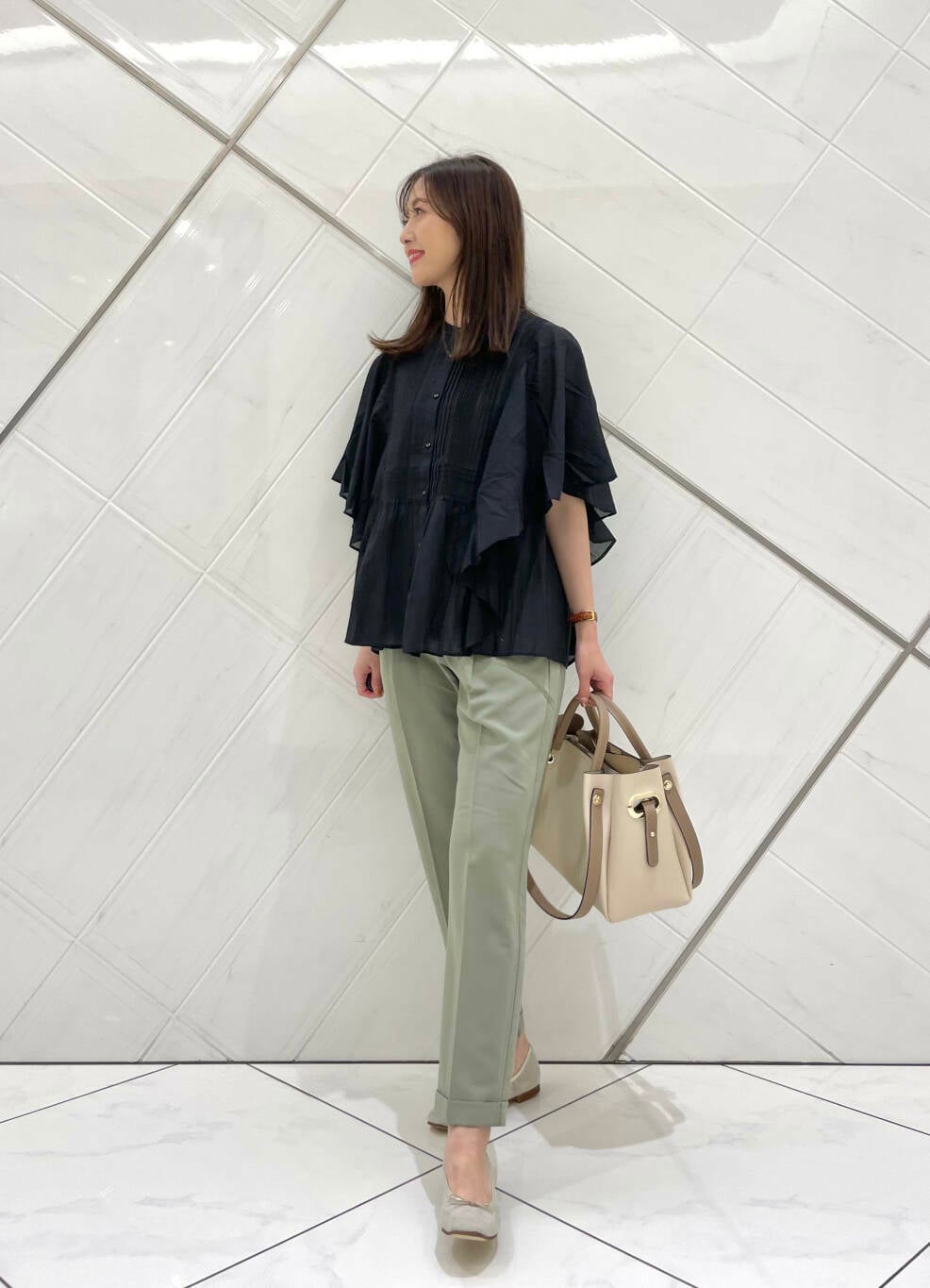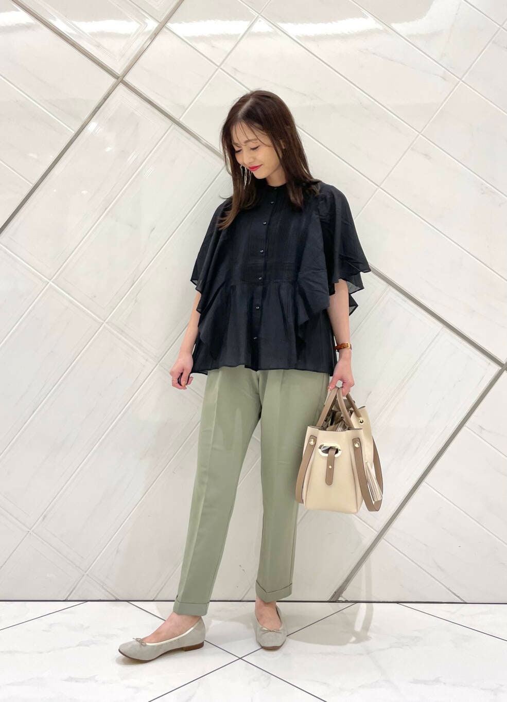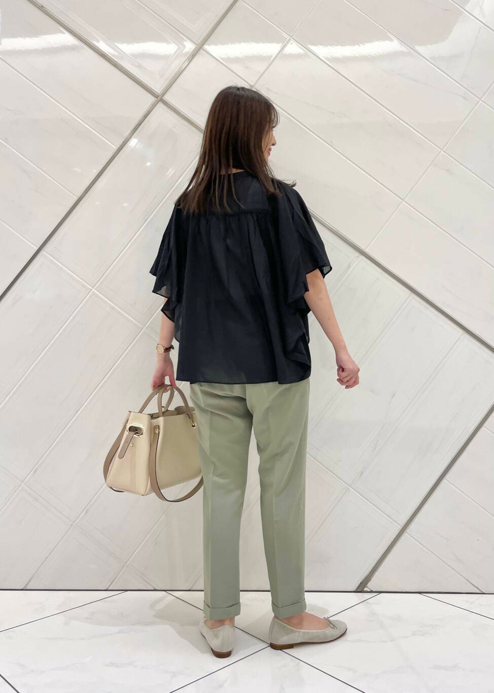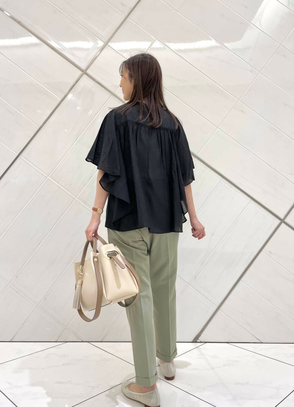 フレアスリーブなので二の腕もカバーでき、パンツスタイルからスカートスタイルまでボトムスも選びません。