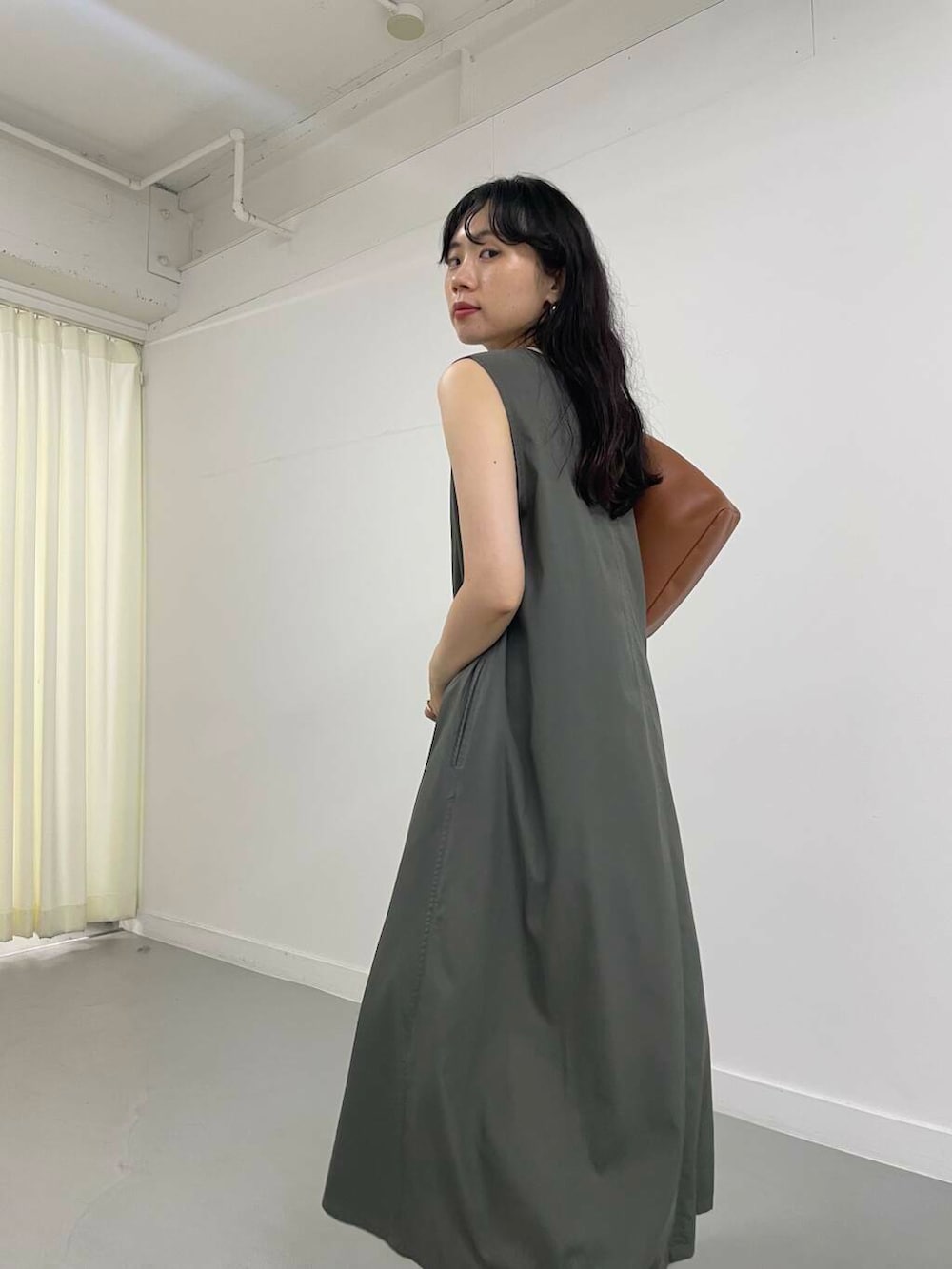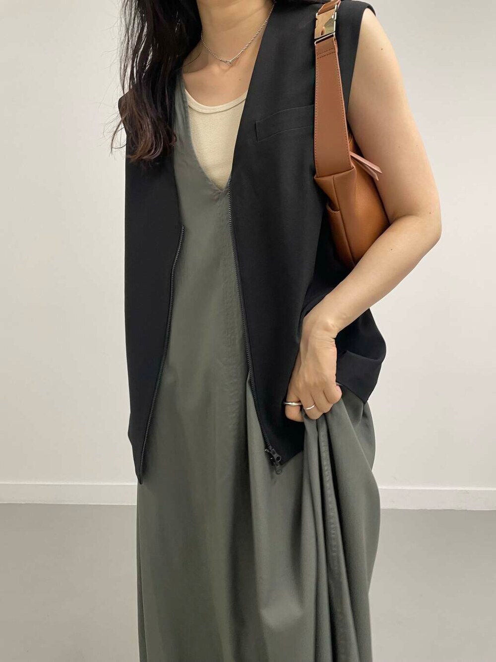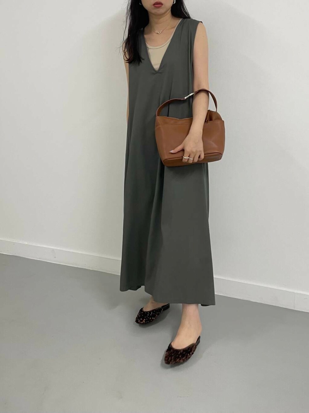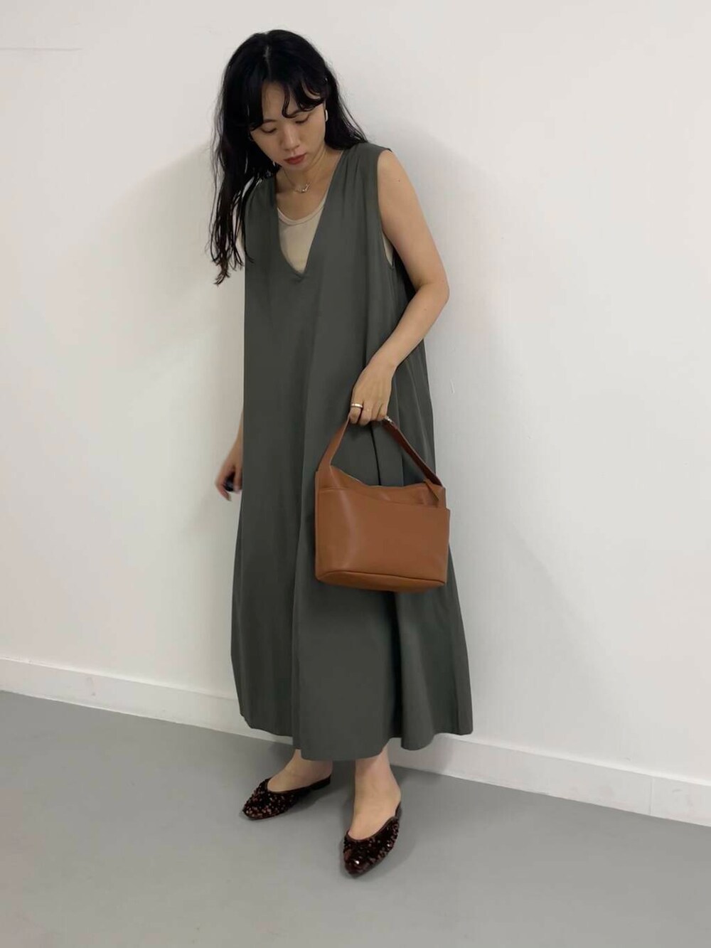 ワンピースはVネックが深く入っているので着痩せ効果も。