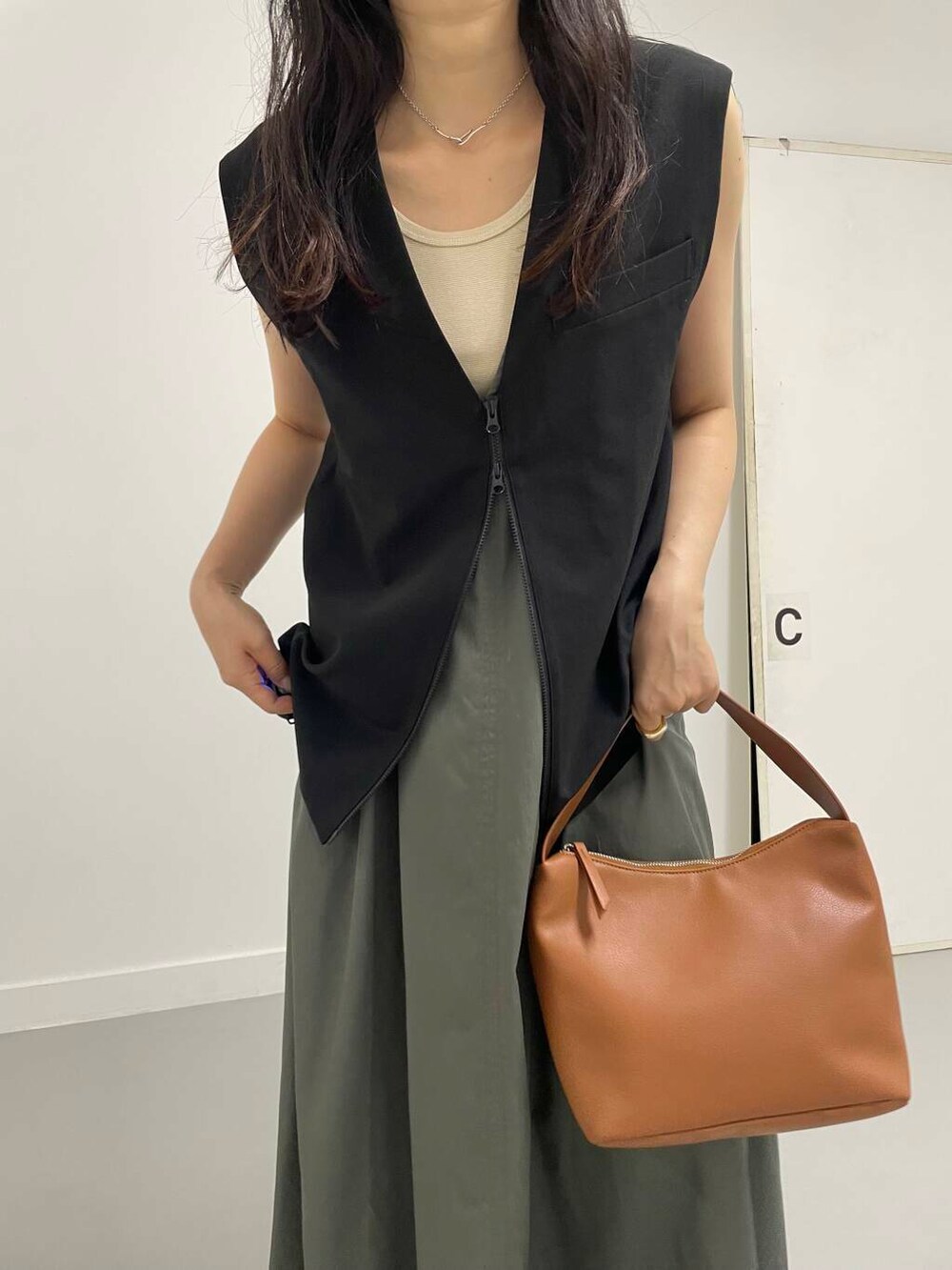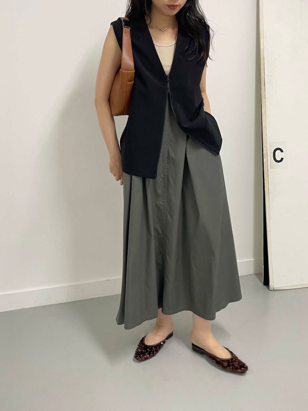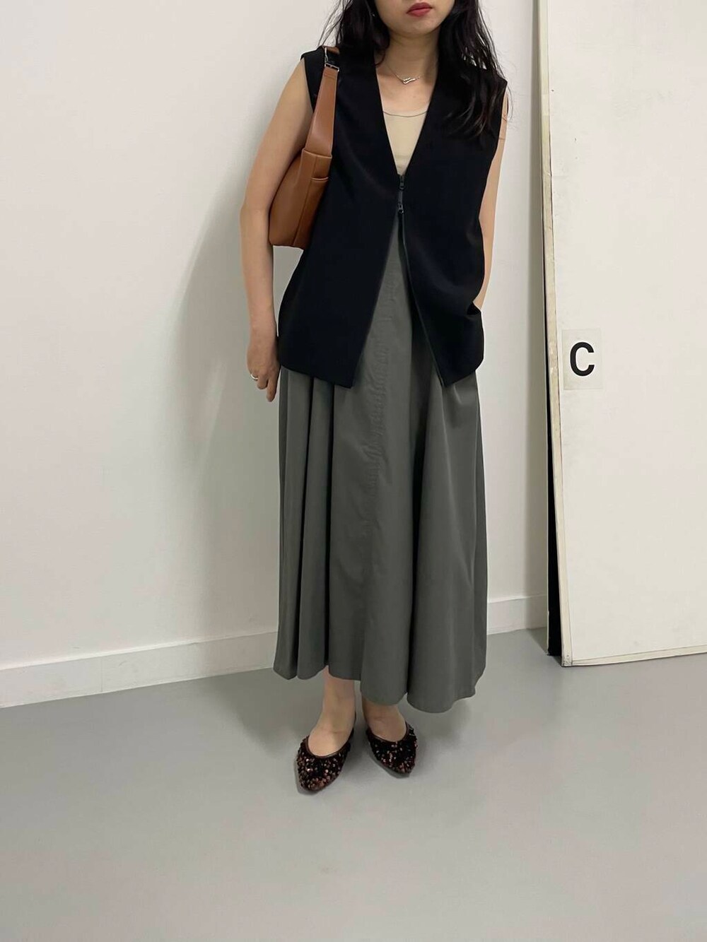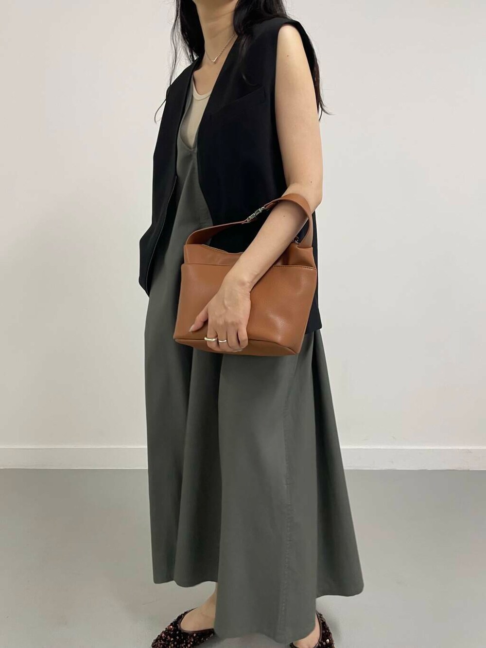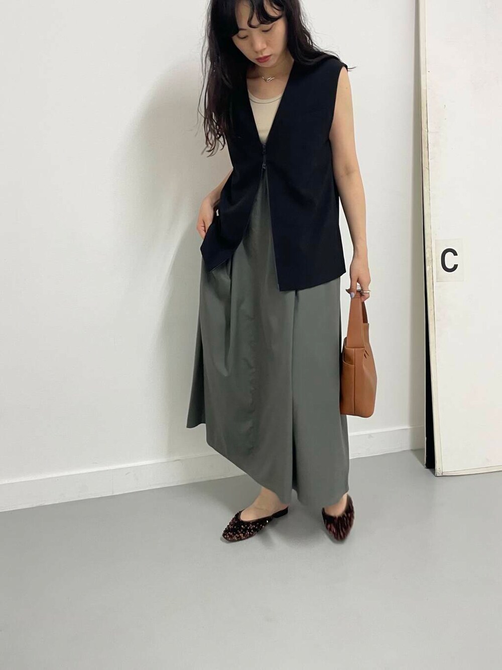ワンピースはVネックが深く入っているので着痩せ効果も。