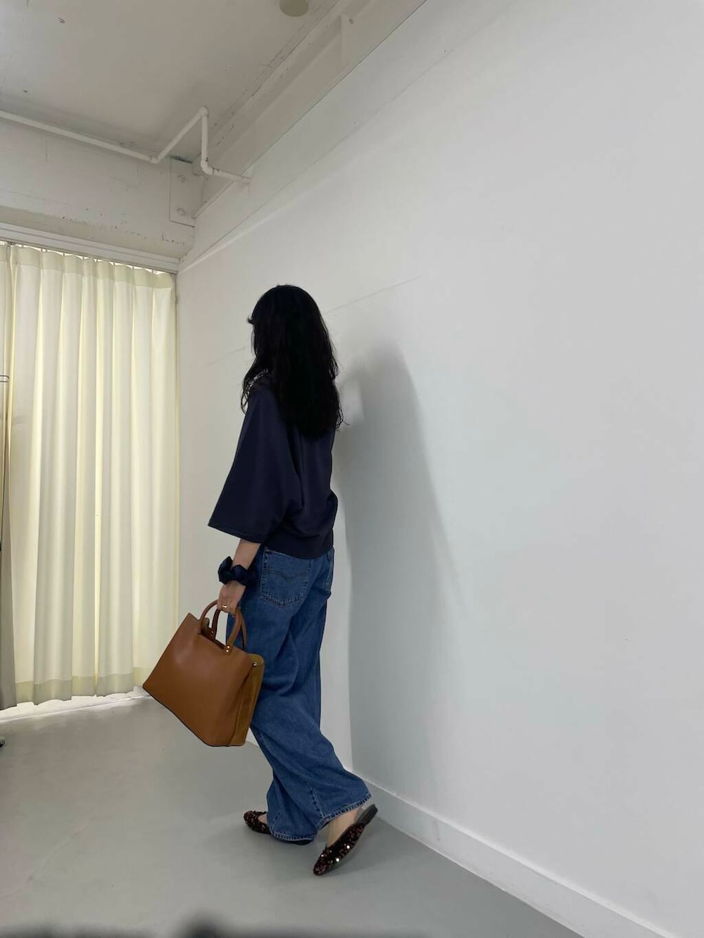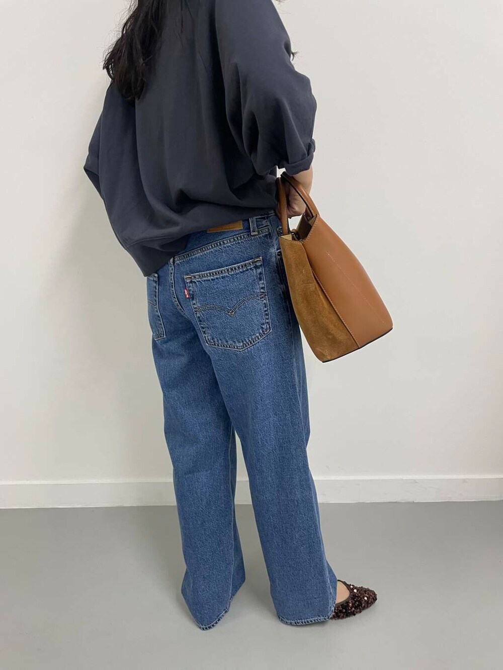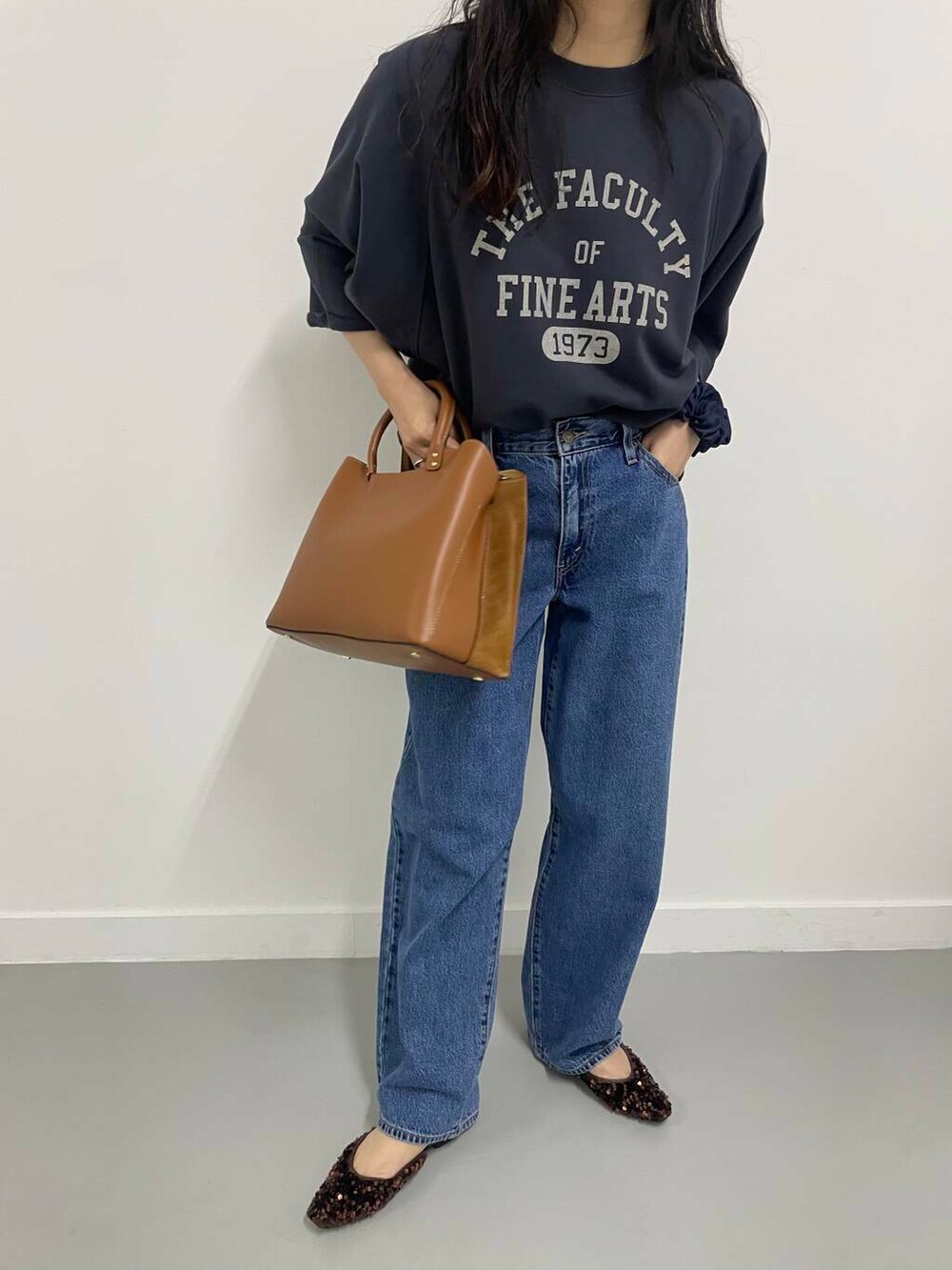 ルーズなスウェットとバギーデニムがゆるいシルエットなので、ミュールで軽めにバランスを取り、バッグでリッチな印象に。