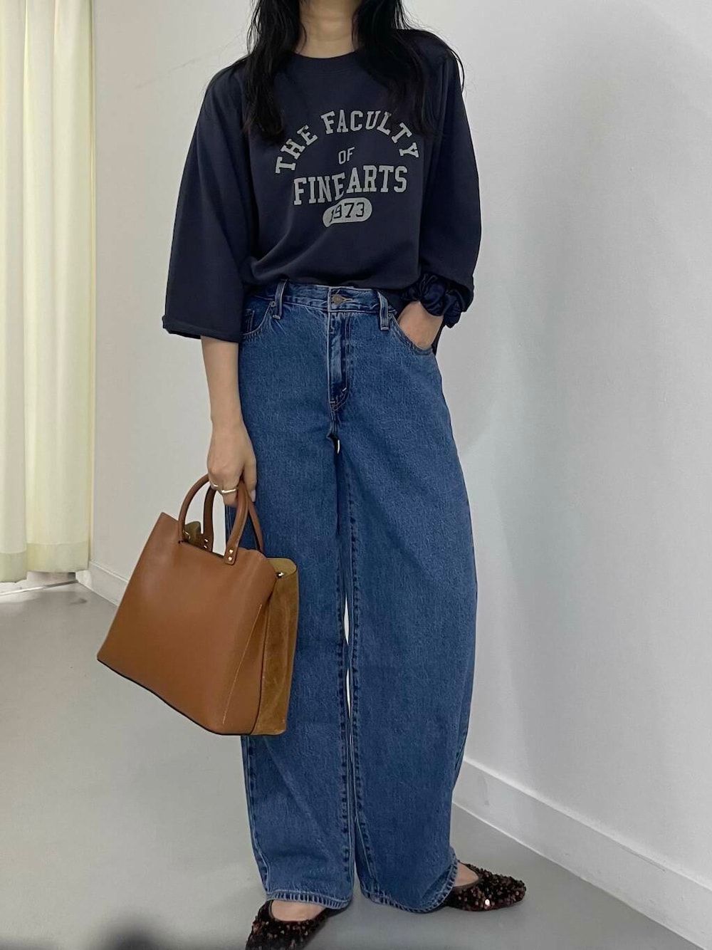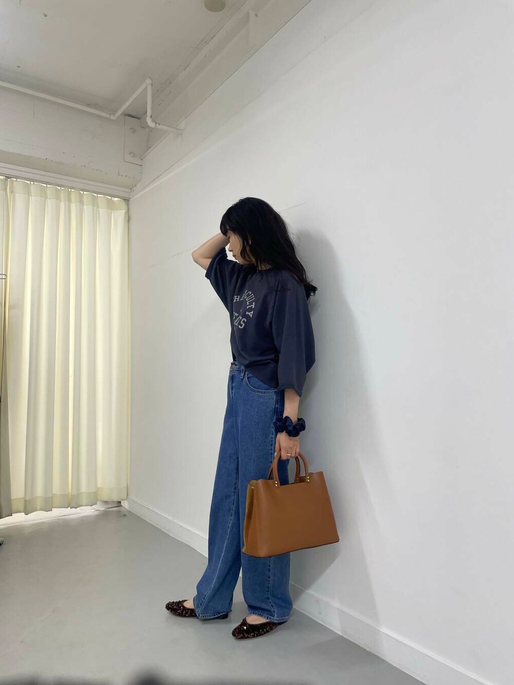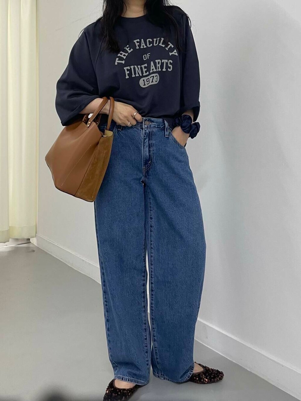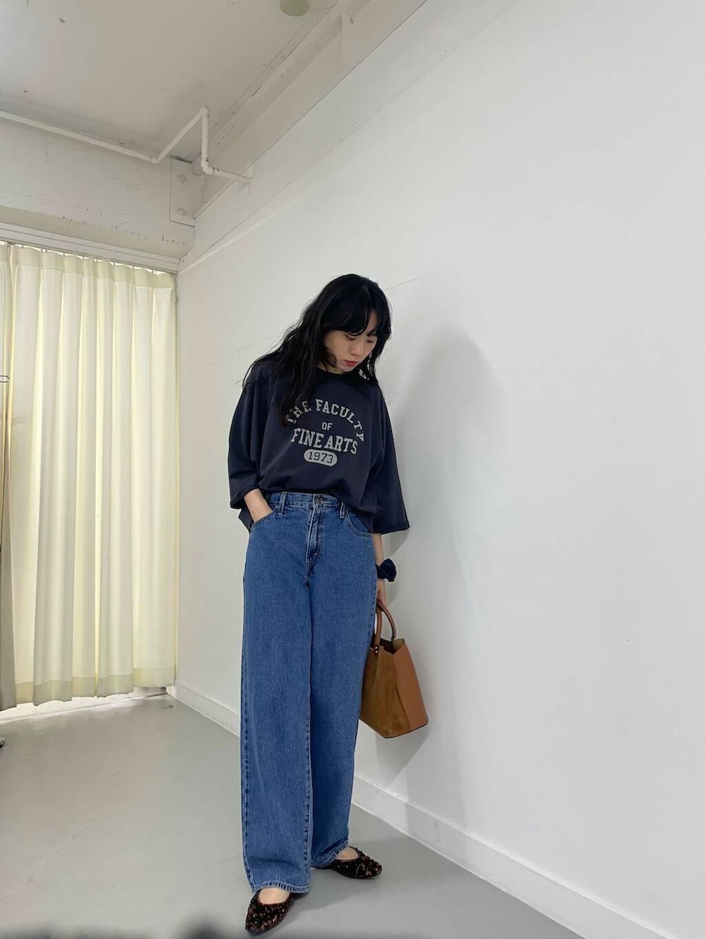 ルーズなスウェットとバギーデニムがゆるいシルエットなので、ミュールで軽めにバランスを取り、バッグでリッチな印象に。