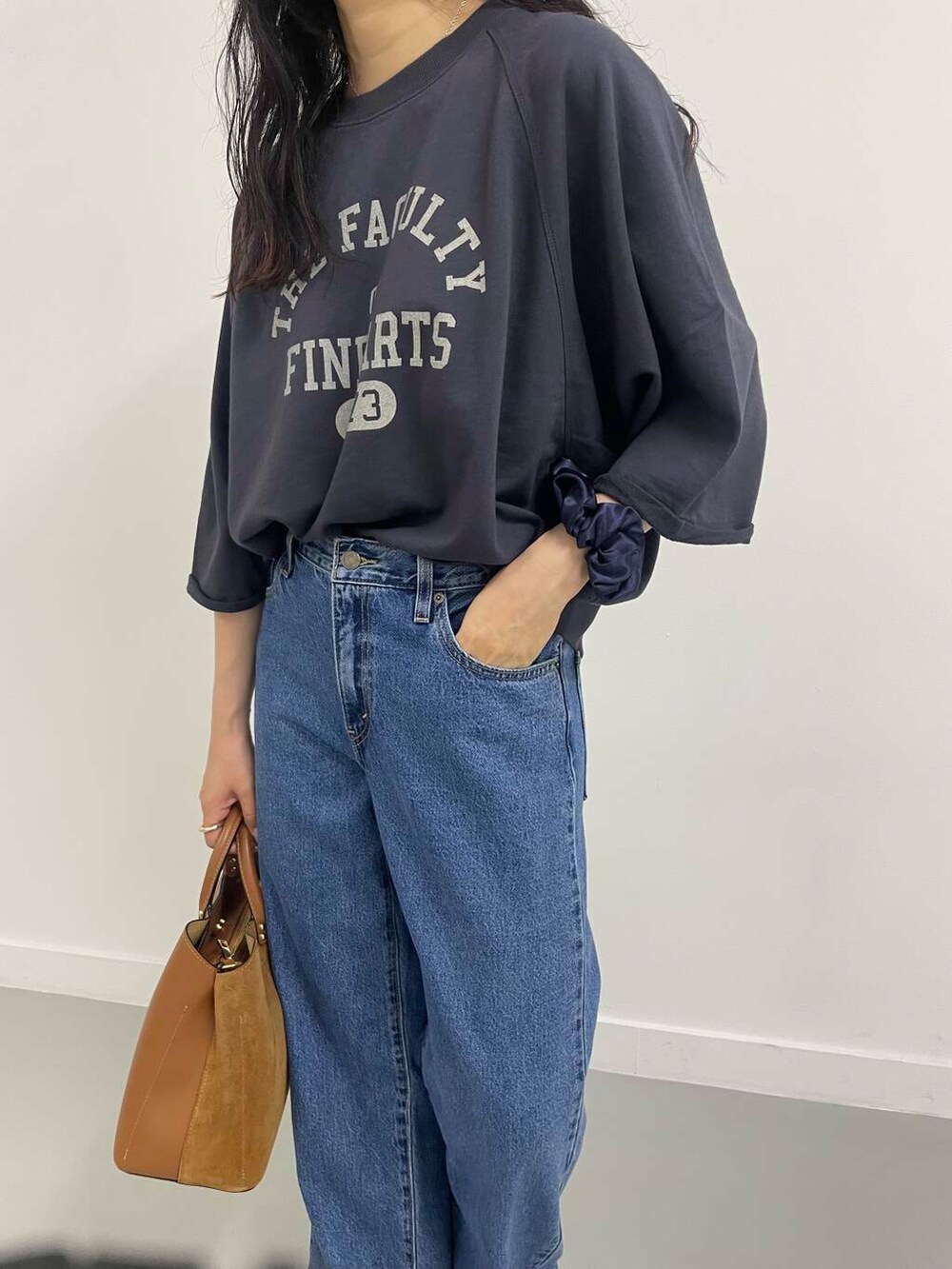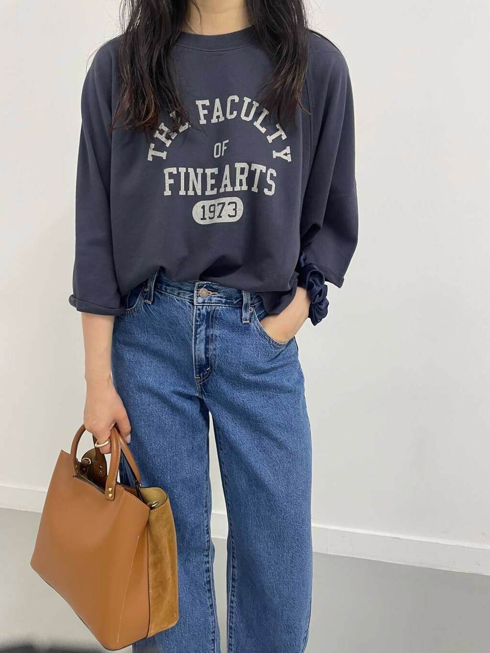 ロゴスウェットは袖も短めで、薄手の裏毛生地が楽な着心地なので、晩夏から取り入れることができますよ。