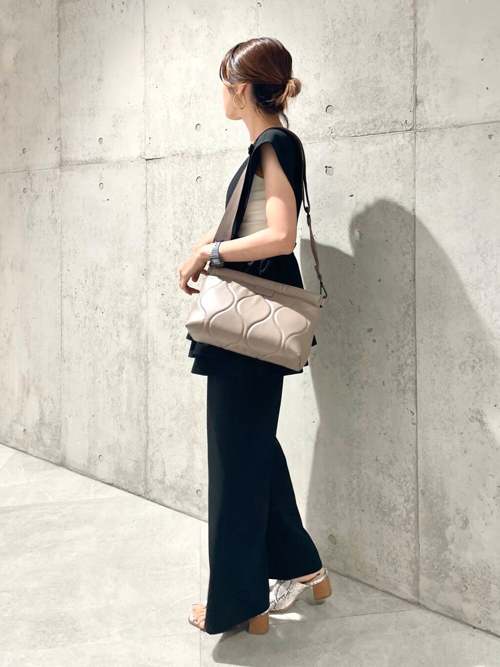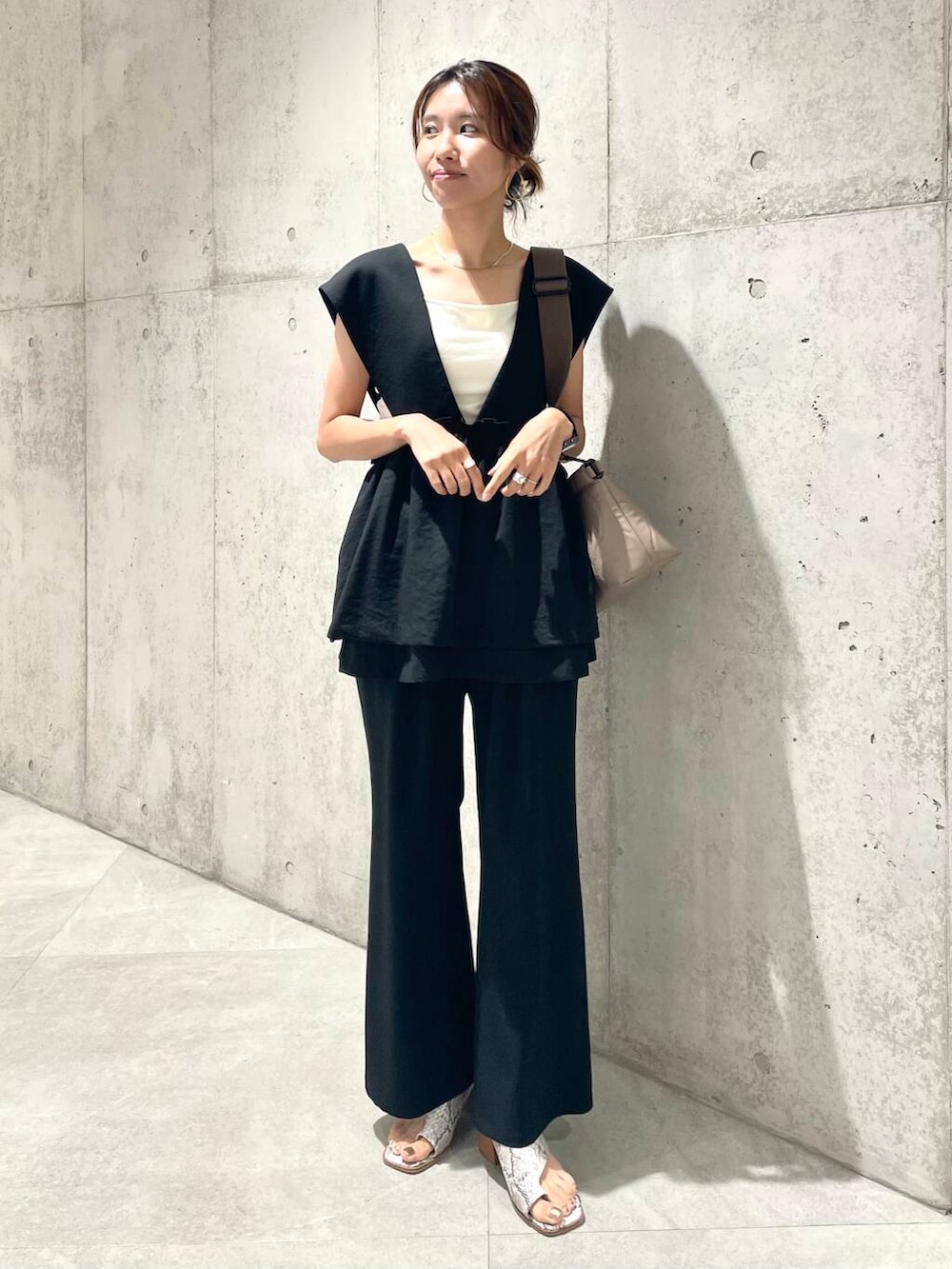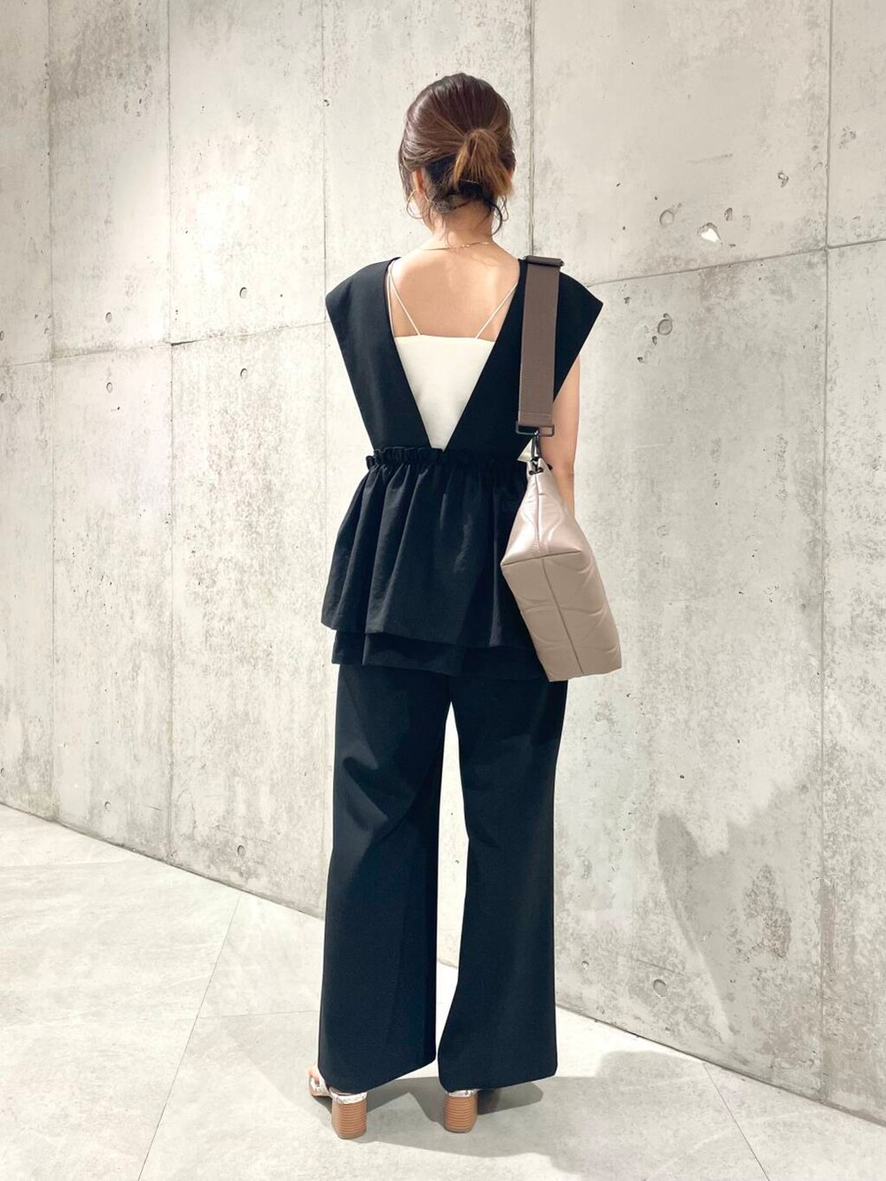 裾の2段フリルが可愛いベストに、セール推しアイテムのストレッチタックワイドパンツを合わせたオールブラックコーデ。