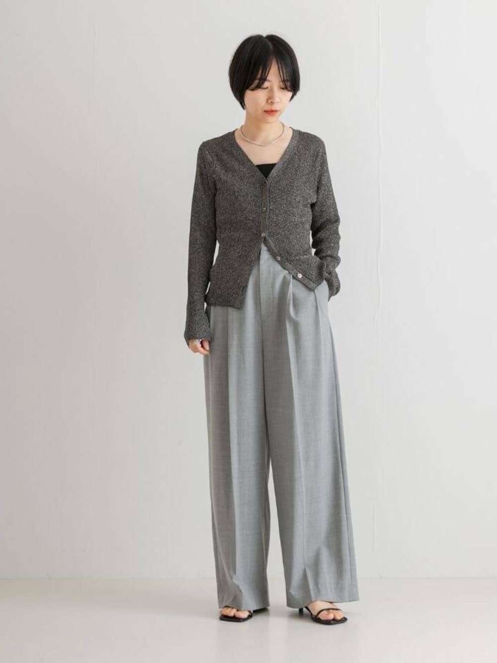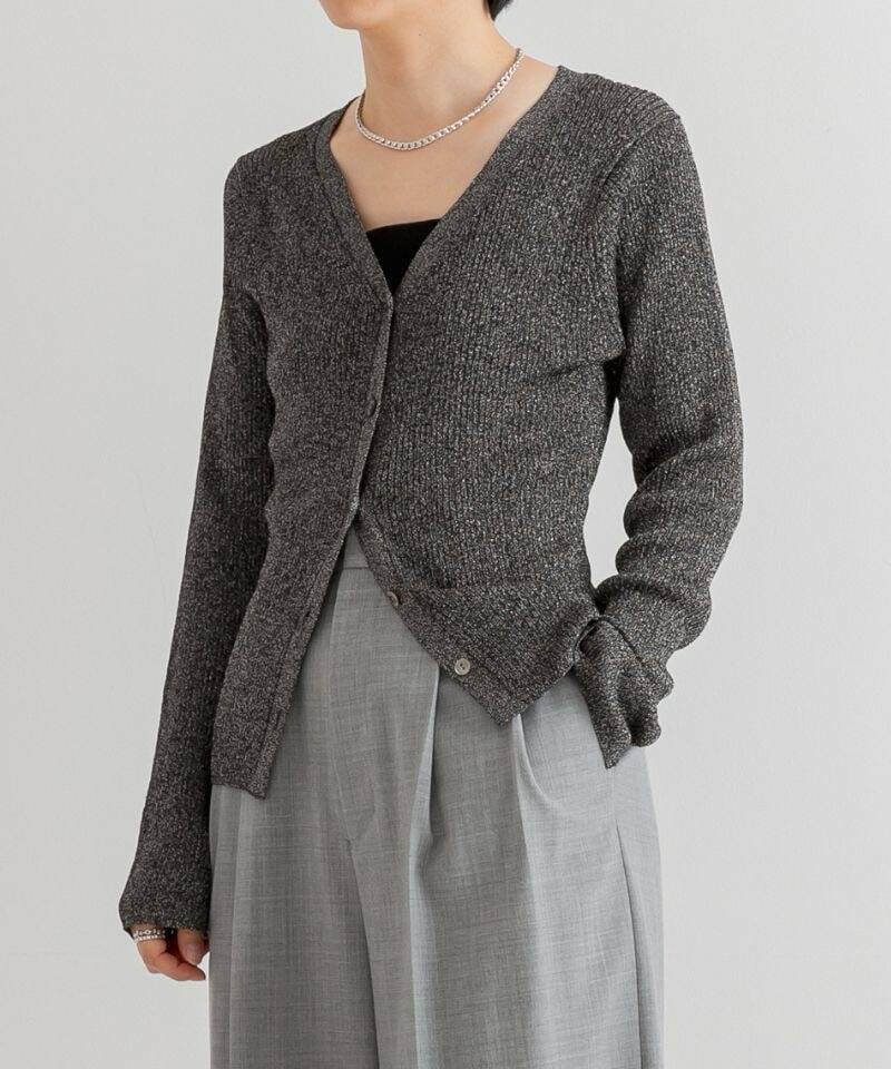 日本製の柔らかなラメ糸を使用しているため、ニット特有のチクチク感がなく、キャミソールなど華奢なインナー合わせでも着用しやすいアイテム。