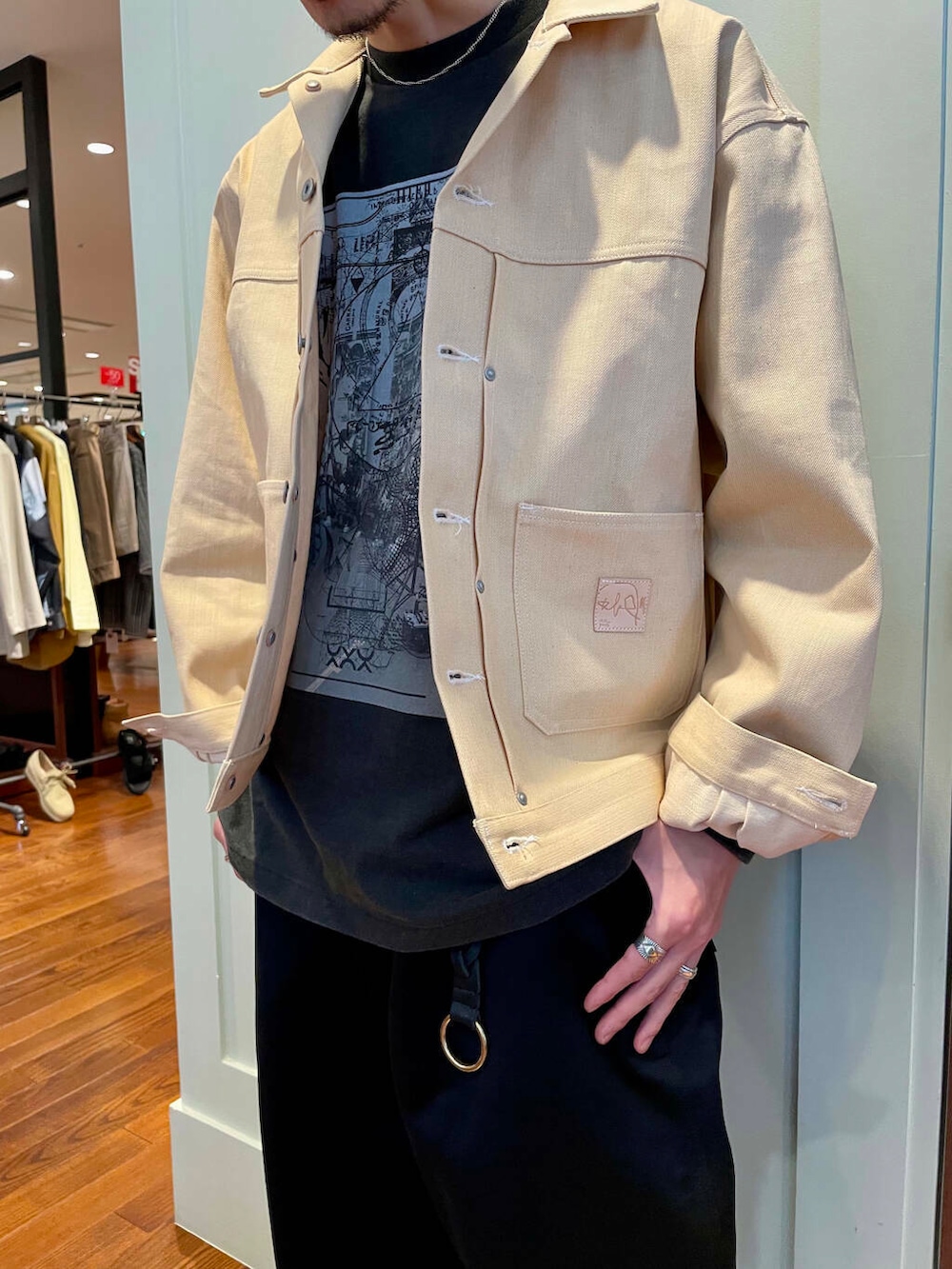 本ブラントのお家芸であるデッドストック生地を使用したブルゾンとパンツ。