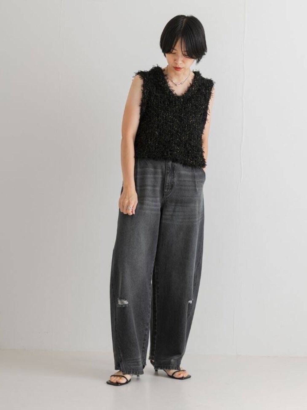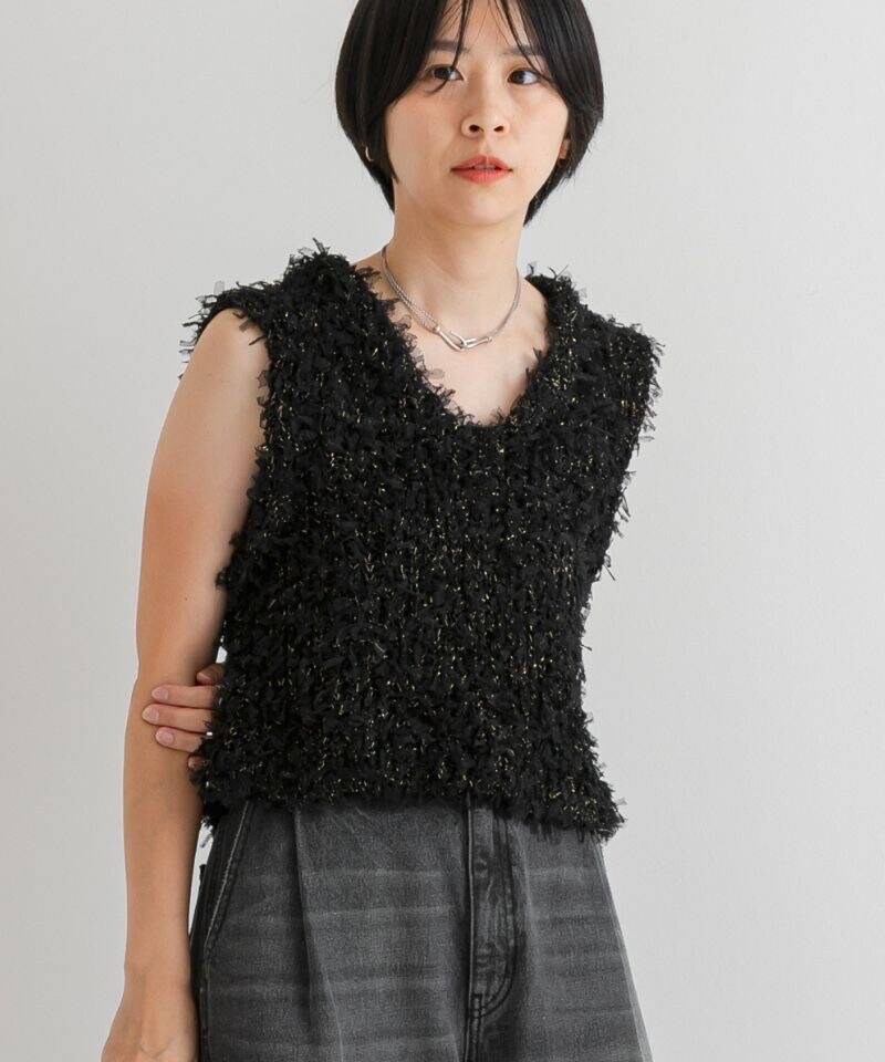トレンド感度の高いチュール素材を使用したニットベストが登場。ラメ糸を施し、華やかで表面感のある旬なアイテムに仕上げました。首元はVネック仕様のため、お顔周りをすっきりと演出◎1枚はもちろん、カットソーやシアーニットとのレイヤードスタイルもお勧めです。レディライクな装いを演出する、今季注目頂きたい主役級アイテムに。