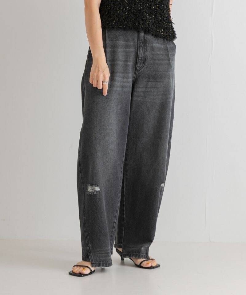 素材は11.5オンスのごわつかない、程よい厚みの生地を使用。脇の切り替えを利用したカーブを描くパターンは、膝あたりで膨らむ自然なコクーンシルエットを実現しました。ウエストに施したタックで、おなか周りが苦しくなくリラクシーに着用が可能。裾脇に入ったスリットは、足の甲にのって開くようにデザインされています。パンツの裾を引きずらないよう、前は長く後は少し短めに設定。さりげないダメージ加工も魅力ポイントです。