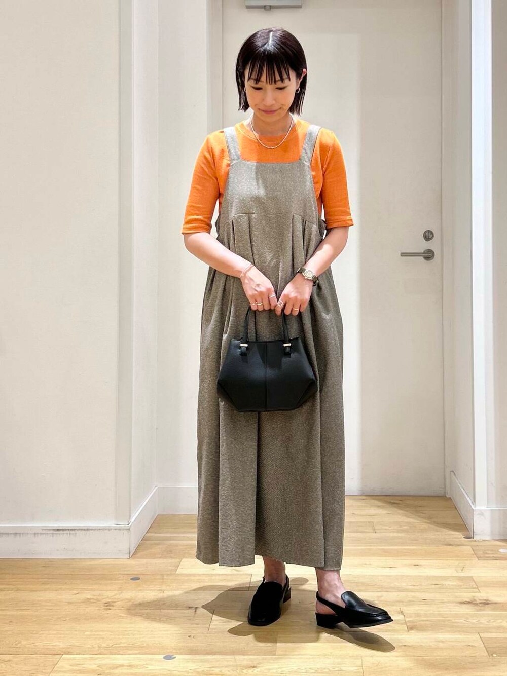 インナーには、綺麗なオレンジのカットソーを合わせてポイントに◎