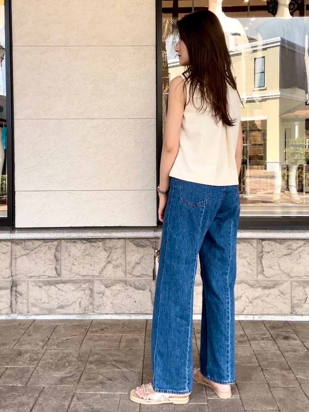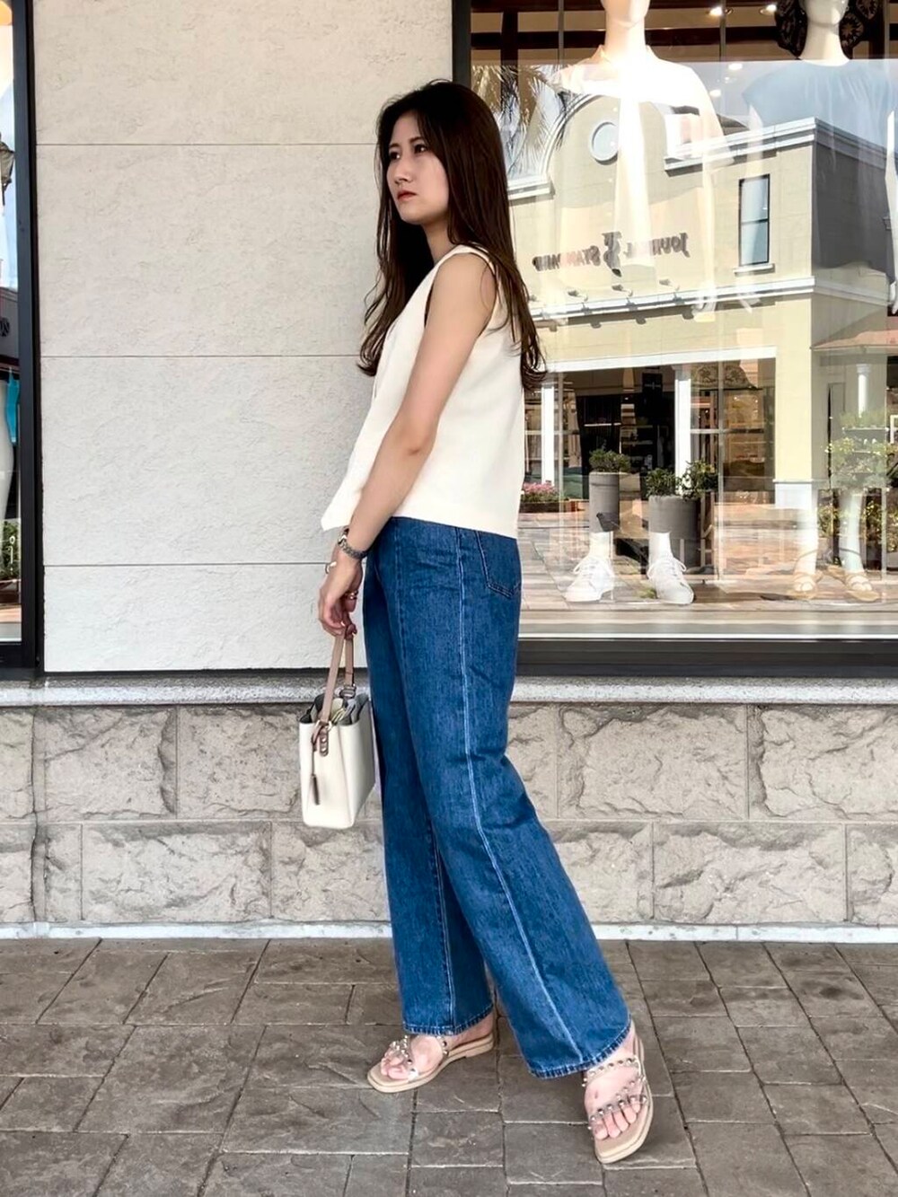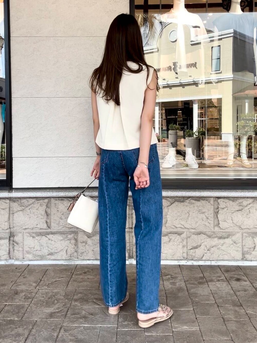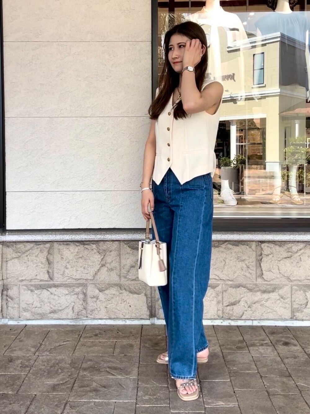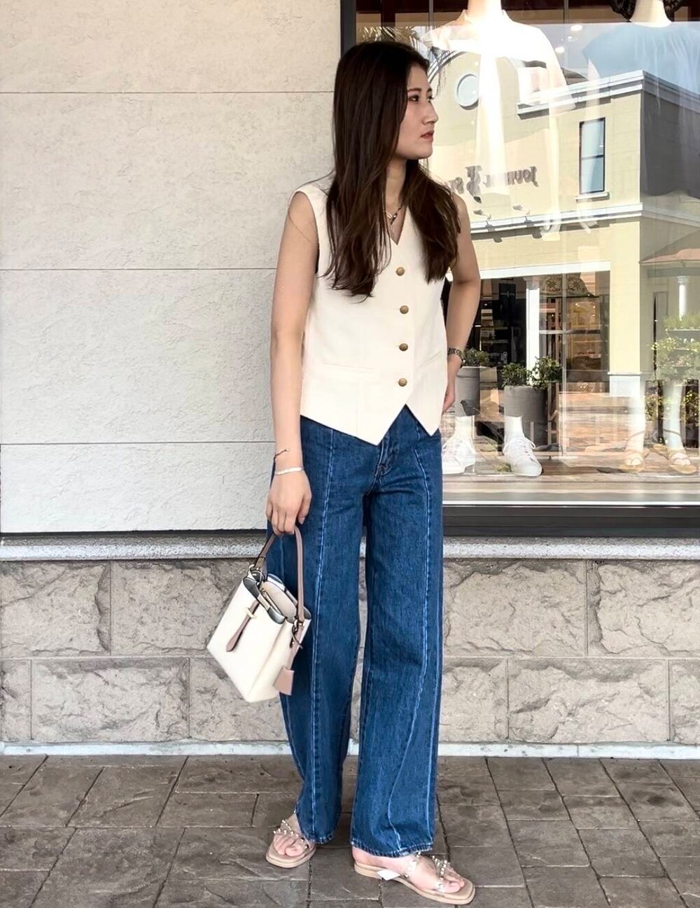 ベストが丈が短めなので、ハイウエストのデニムを選ぶのがオススメ。