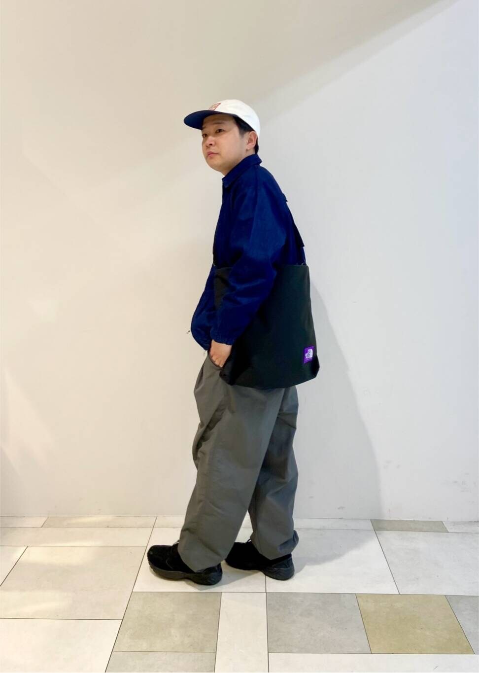 EKALのナイロンパンツを合わせてアウトドアな雰囲気でコーディネートしてます〜。