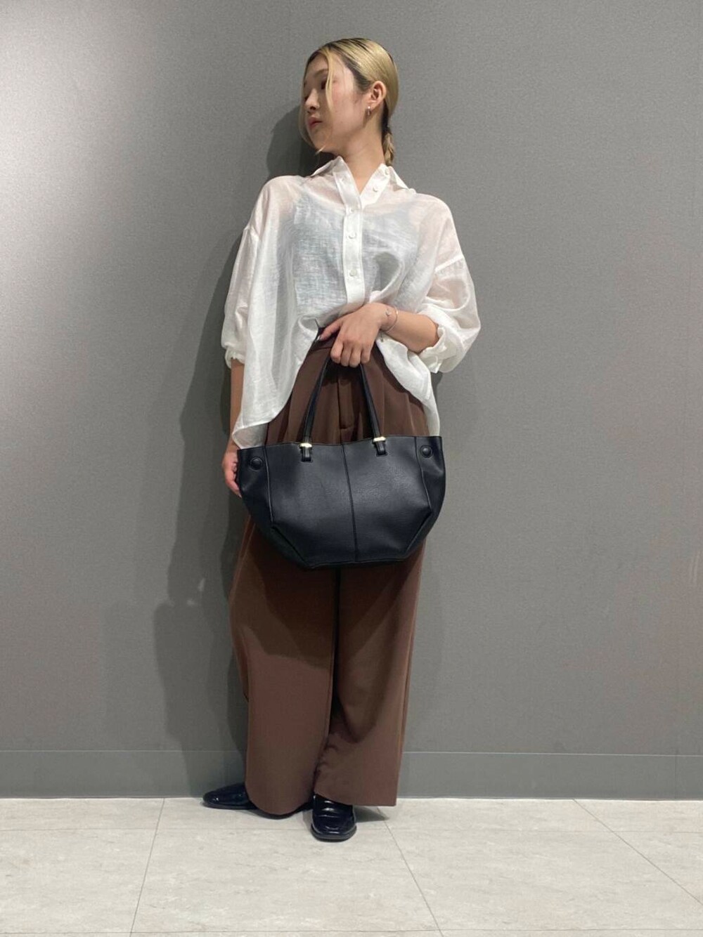 小物は黒で統一感を出して、秋らしいこっくりしたパンツが目立つようにしています!