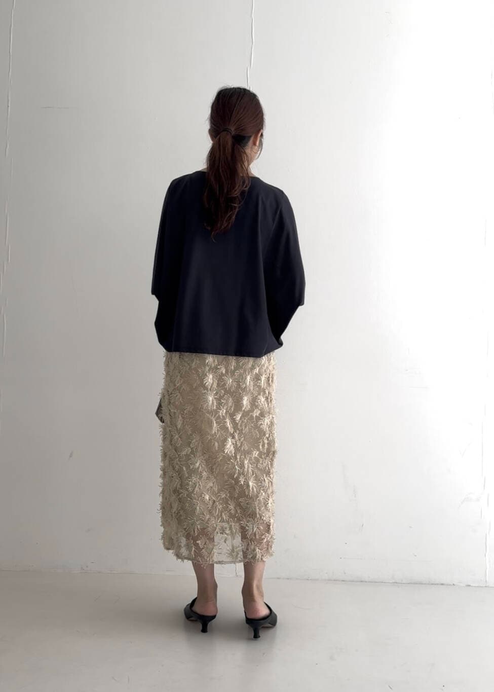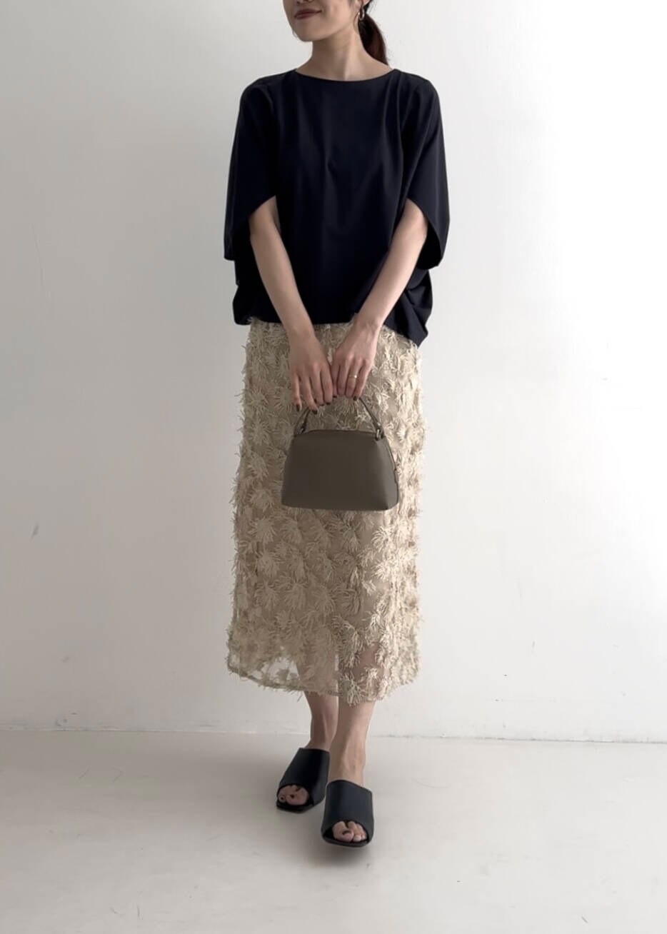 軽さのあるレースレイヤードスカートと合わせて、フェミニンな着こなしもお勧めです。