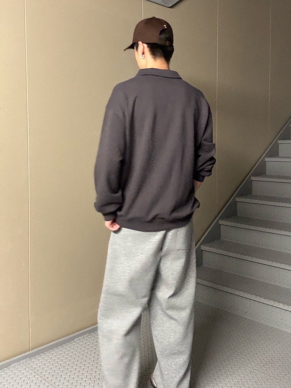 チャコールカラーのポロシャツをメインにした落ち着いたスタイリング。グレーのスウェットパンツを合わせることで、程よくスポーティな抜け感を演出しています。足元はベーシックなスニーカーでまとめ、デイリーユースにぴったりのバランスに。