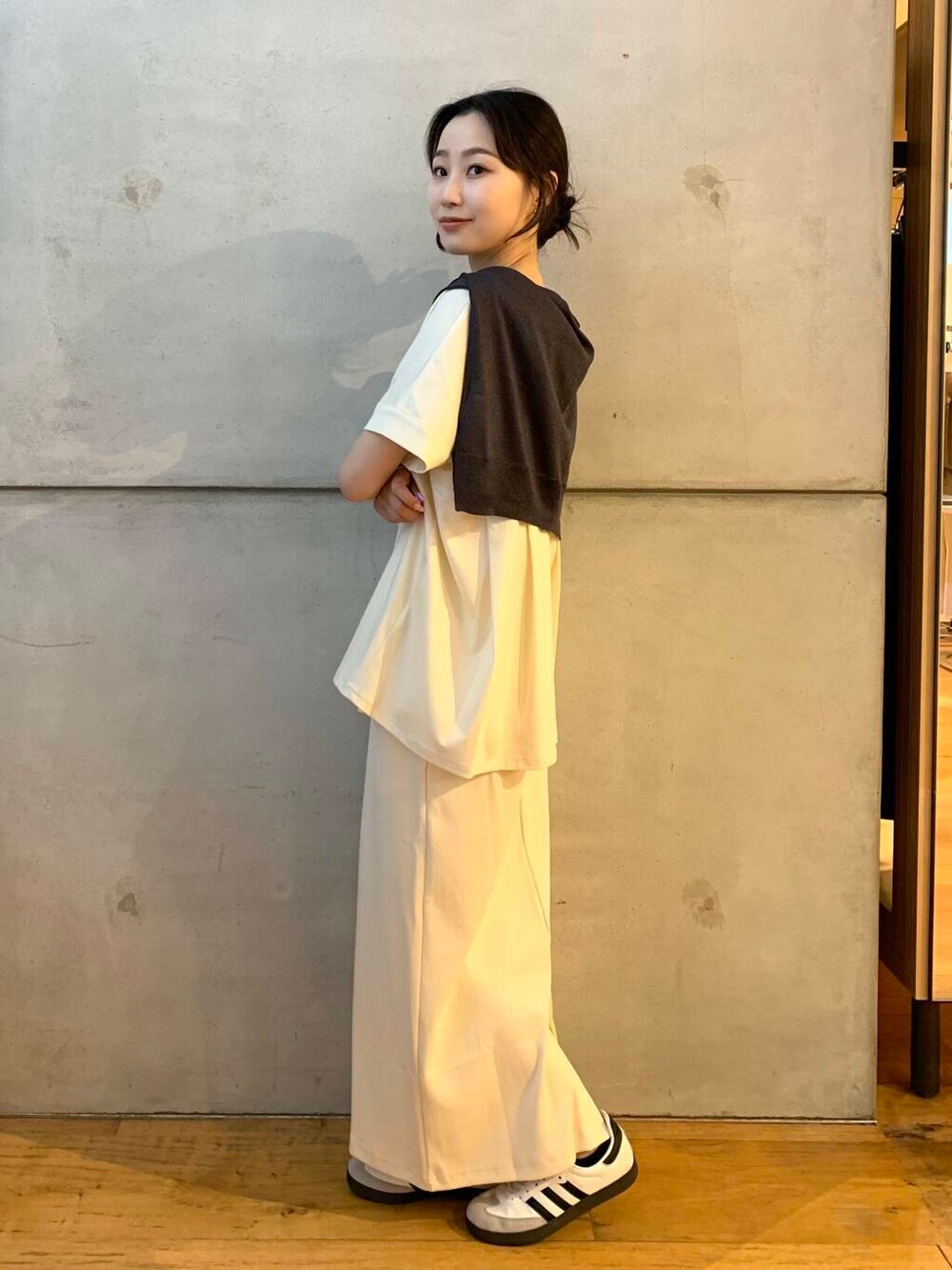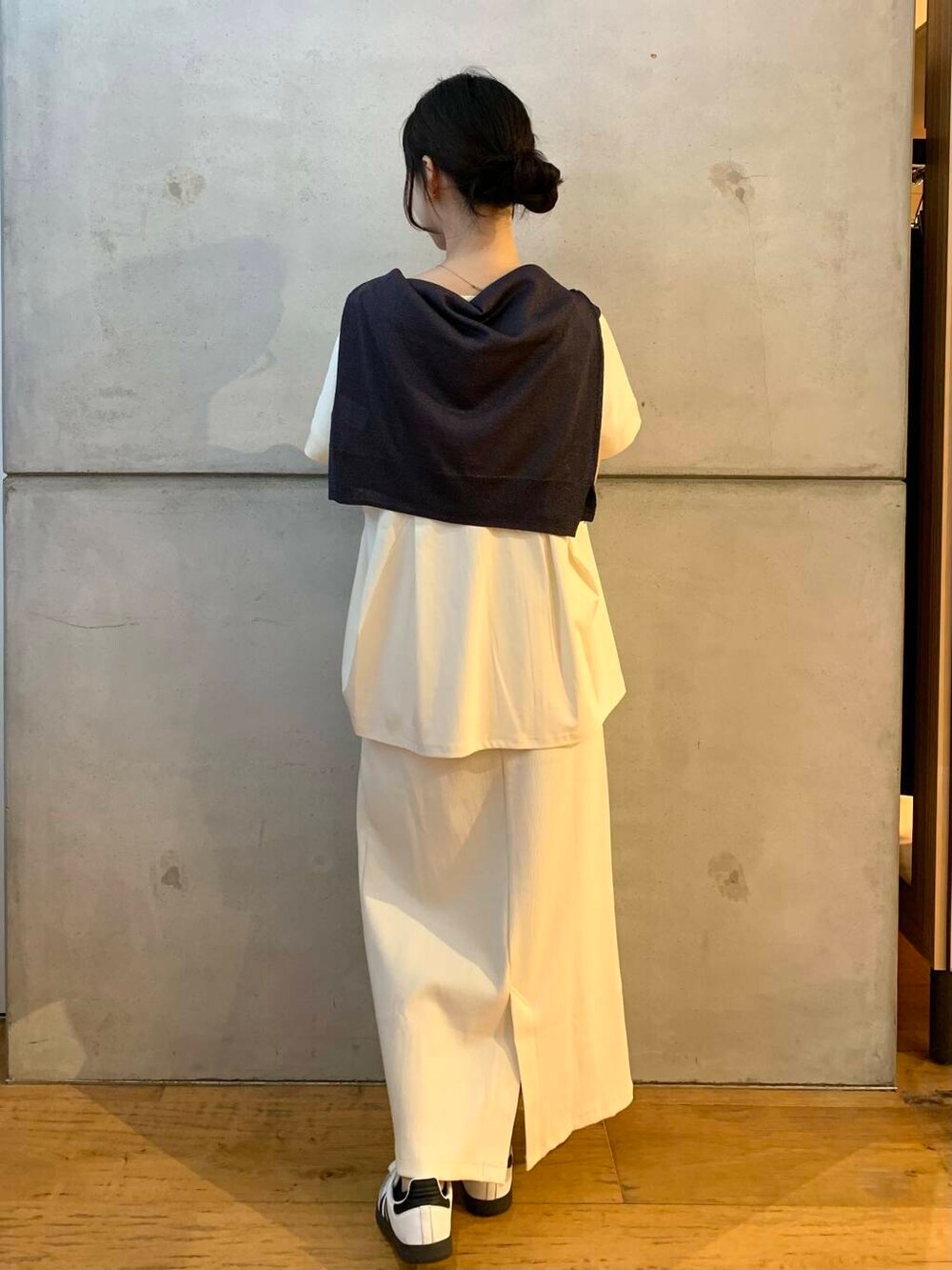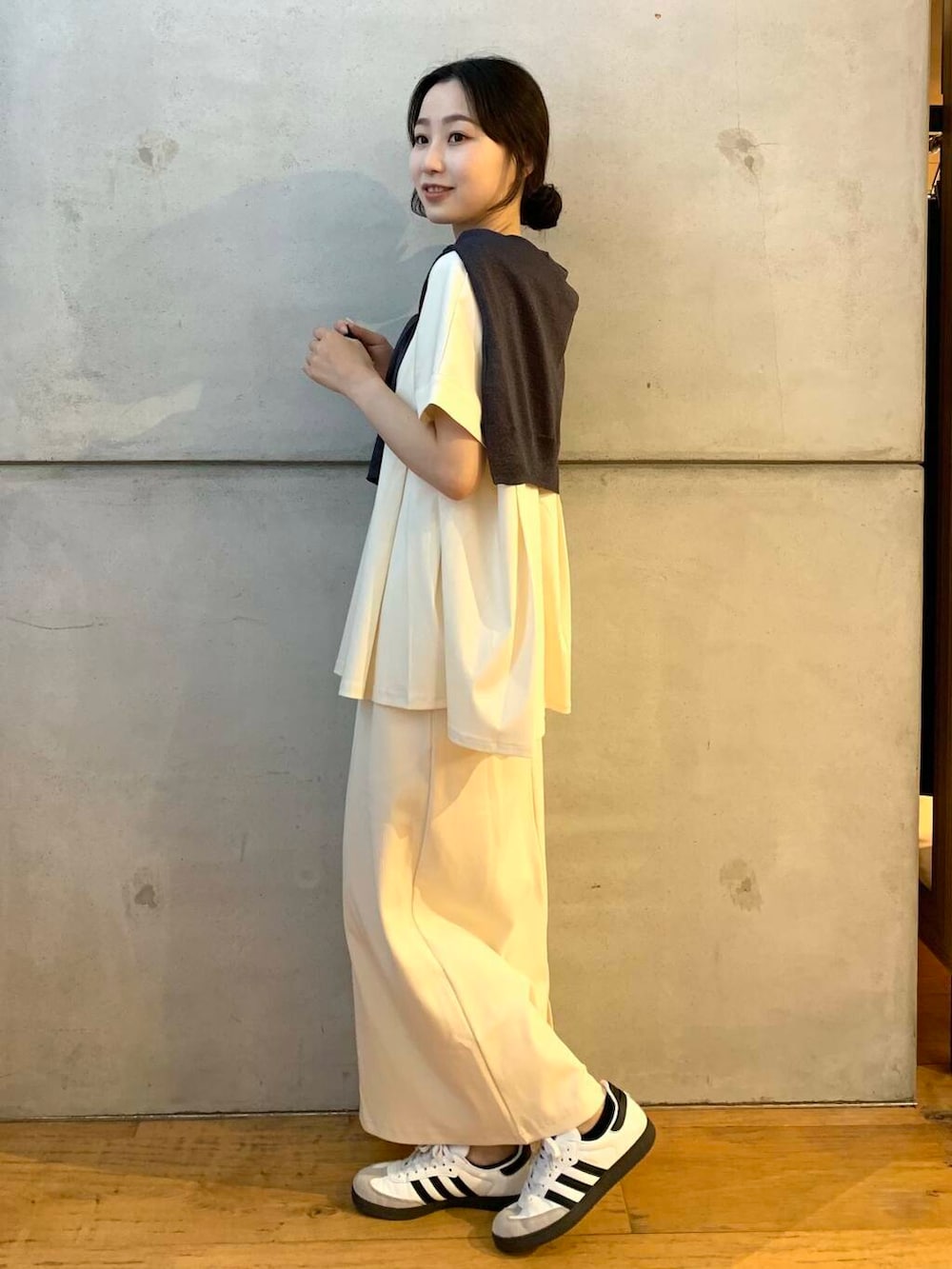 ホワイトコーデではありながら、肩にかけているカーディガンを暗めの色味にすることで全体としてぼやけず、まとまっています✨
