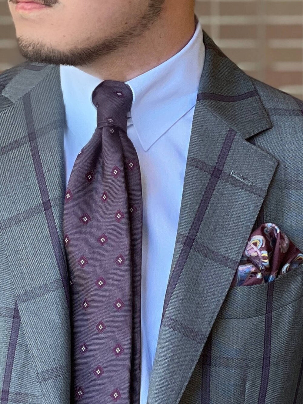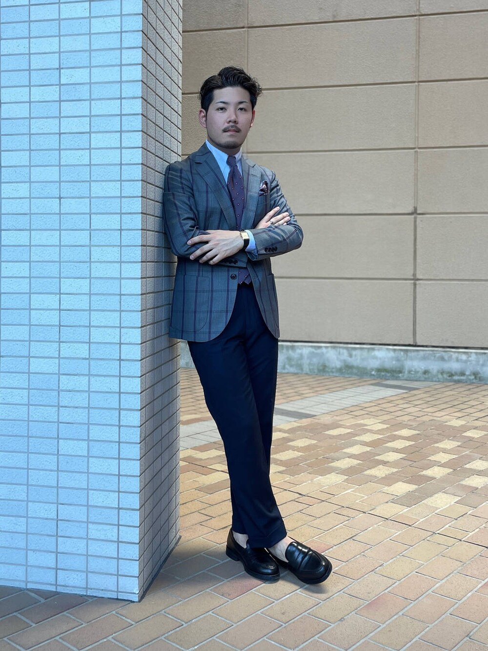 ネクタイの色味を活かしてやや色気のある